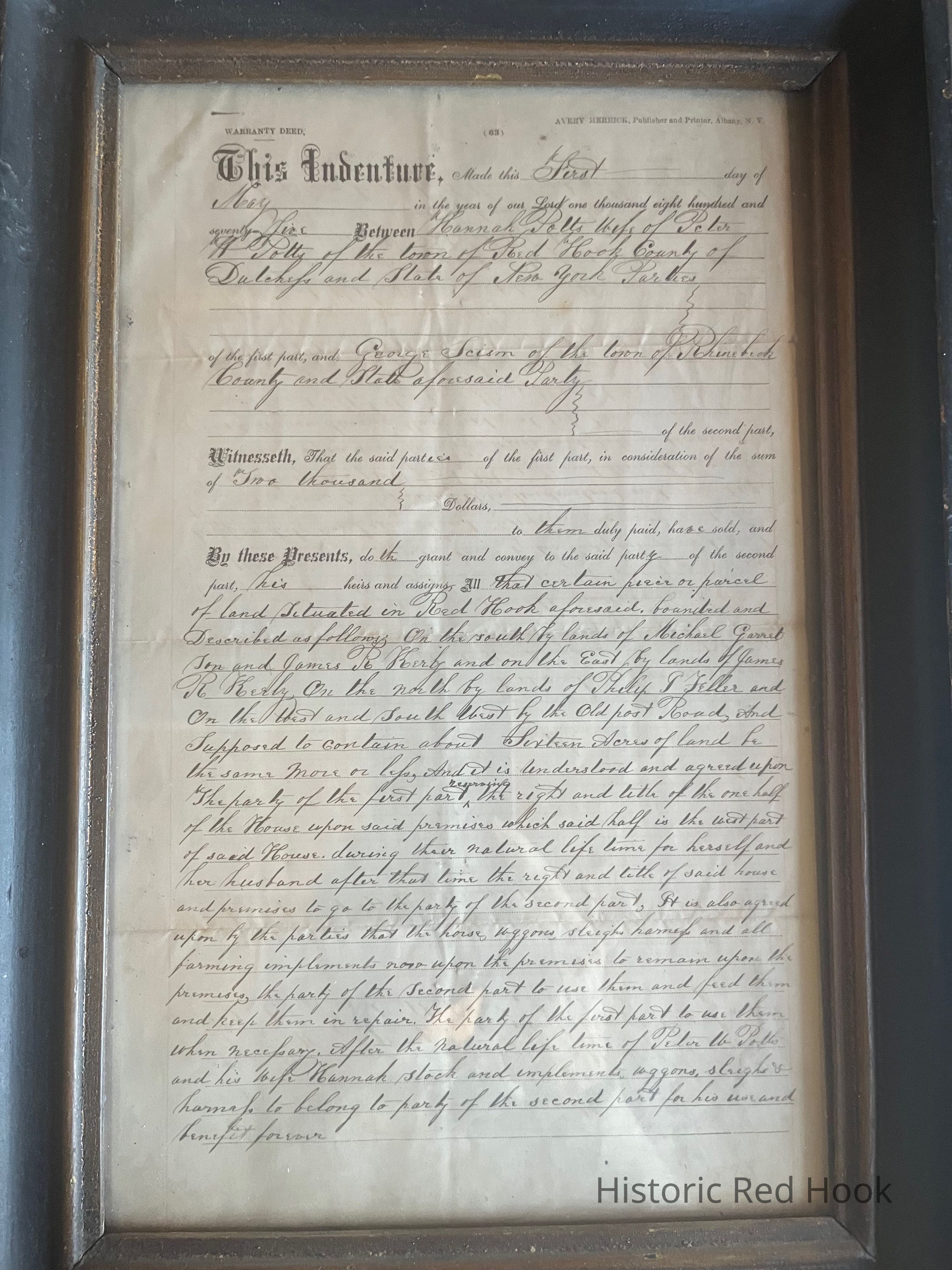 Original deed in frame, May 1, 1875: Hannah Potts, wife of Peter H. Potts, sells 16 acre farm (later Wil-Hi Farm) to George Scism, for $2,000. The deed states that Hannah and her husband would retain lifetime rights to live on the west side of the farmhouse, and noted that “ all horses, wagons, sleighs, harnesses, and all farming implements should remain on the premises,” with the new owner agreeing to “use them and feed them and keep them in repair,”Photograph Details