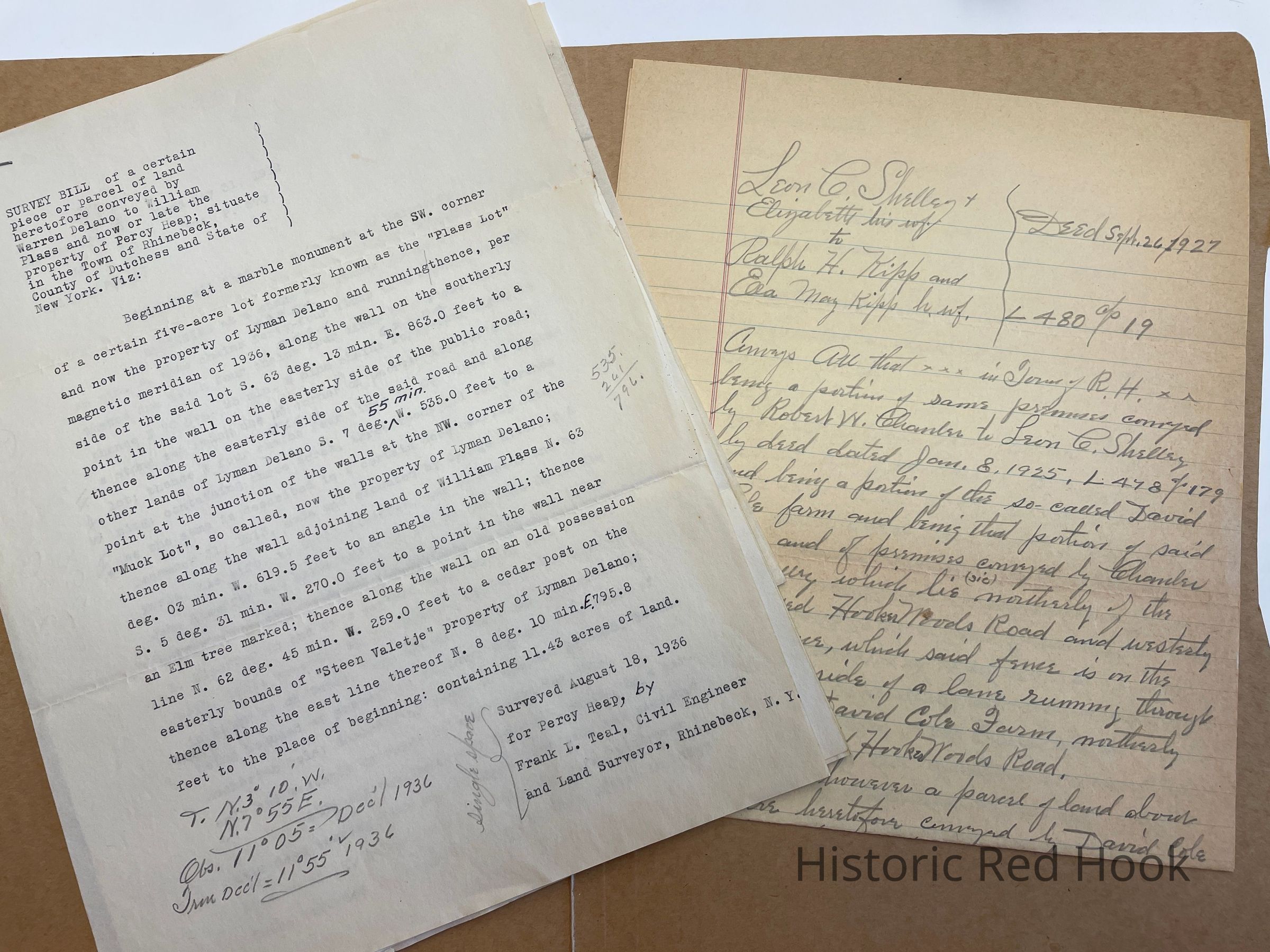 Survey: For Percy Heap 18 Aug 1936 Parcel from Warren Delano to William Plass, late property of Percy Heap 11.43 acres