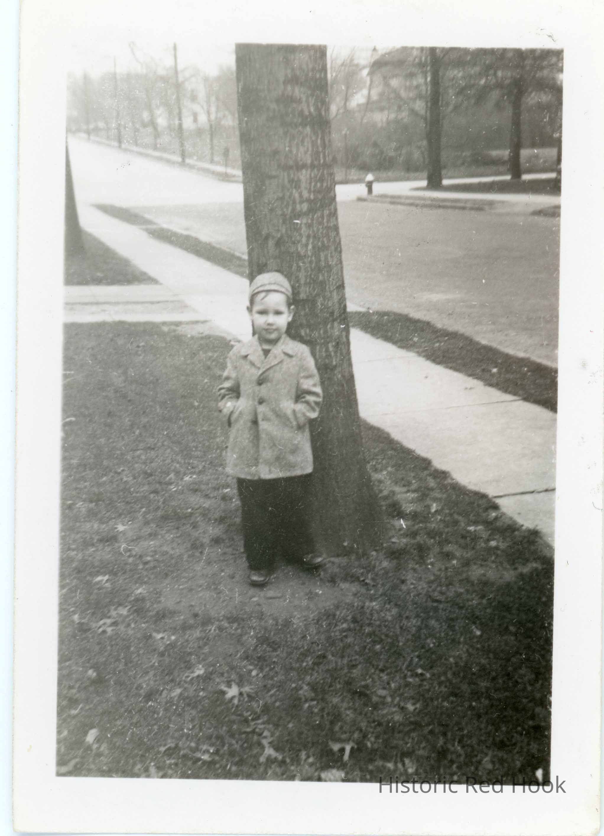 Photograph of a young boy posed in front of a tree near a sidewalk along a street identified as Dick Thomas.Photograph Details
