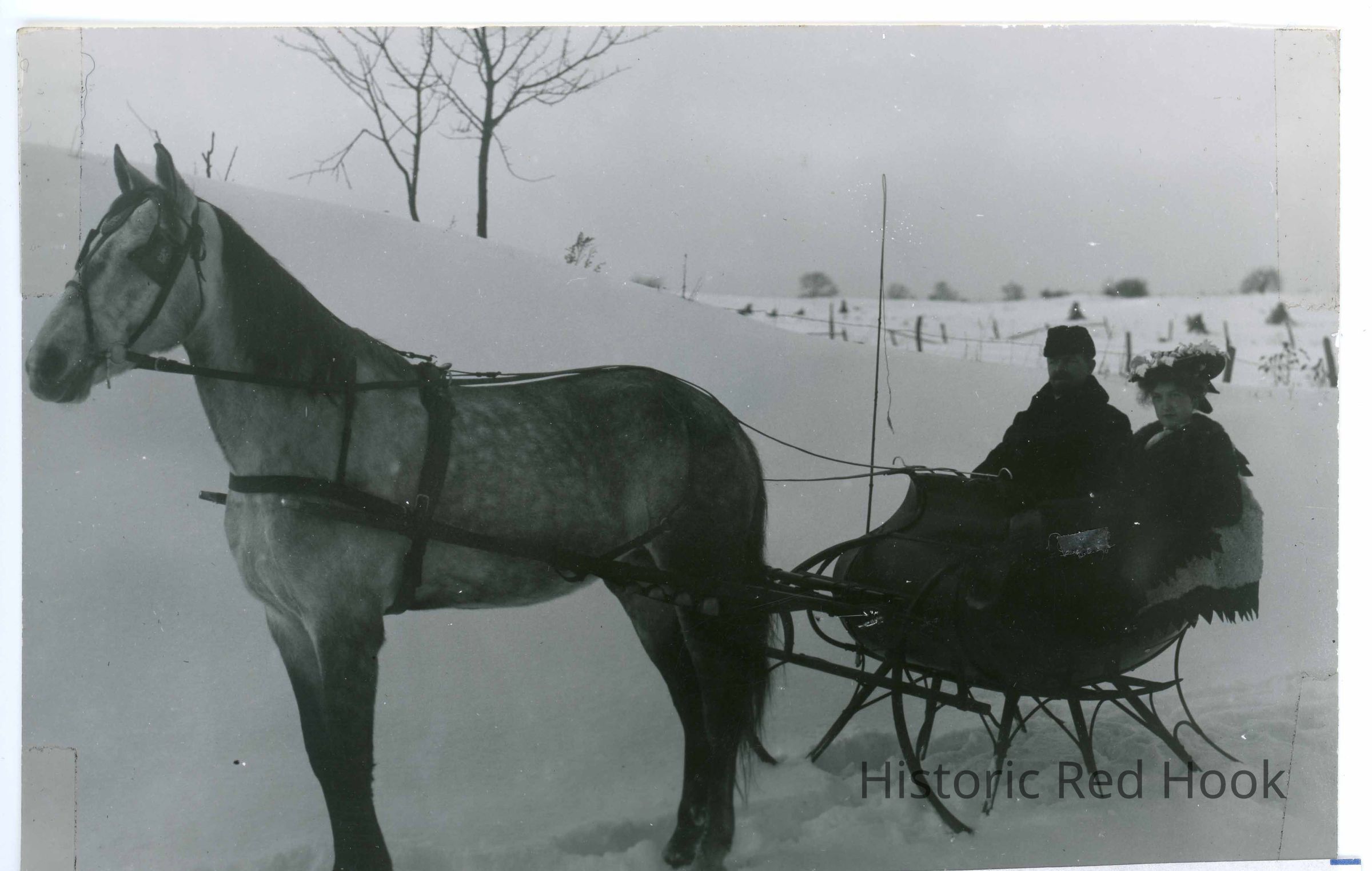Horsedrawn sleigh aside a hill with two people pictured identified as Dr. H. Losee & Adelaide Elting. Ref. W. S. Teator Glass Plate Negative #7 Neighbors Reversed 2014.008.142Photograph Details