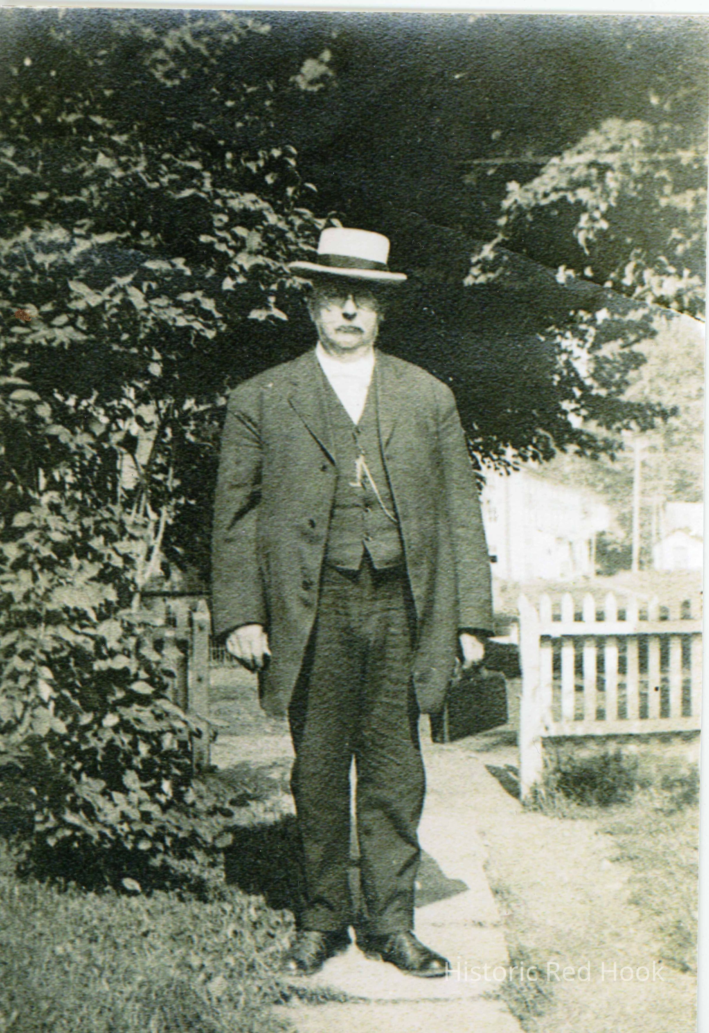 Photo of Dr. Harris L. Cookingham standing on sidewalk holding a doctors' bag. Written on back 'Dr. Harris L. Cookingham was the town doctor for the Red Hook area. This picture was taken as he entered our (Shafers) yard at 9 Elizabeth Street, Red Hook, NY'Photograph Details