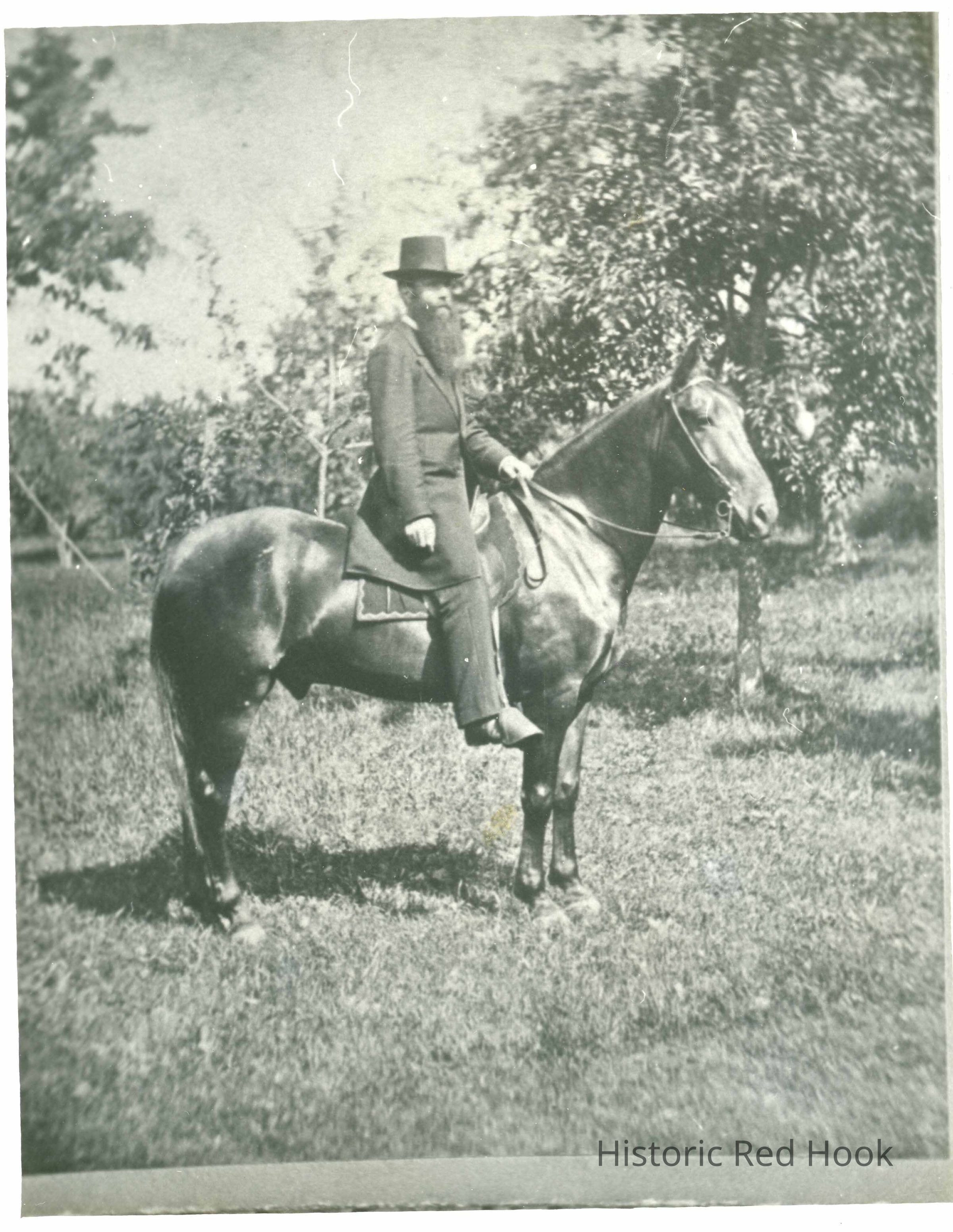Photograph (2 copies) of a bearded man, identified as Dr. Carroll, seated on a horse identified as Pedro near trees.Photograph Details
