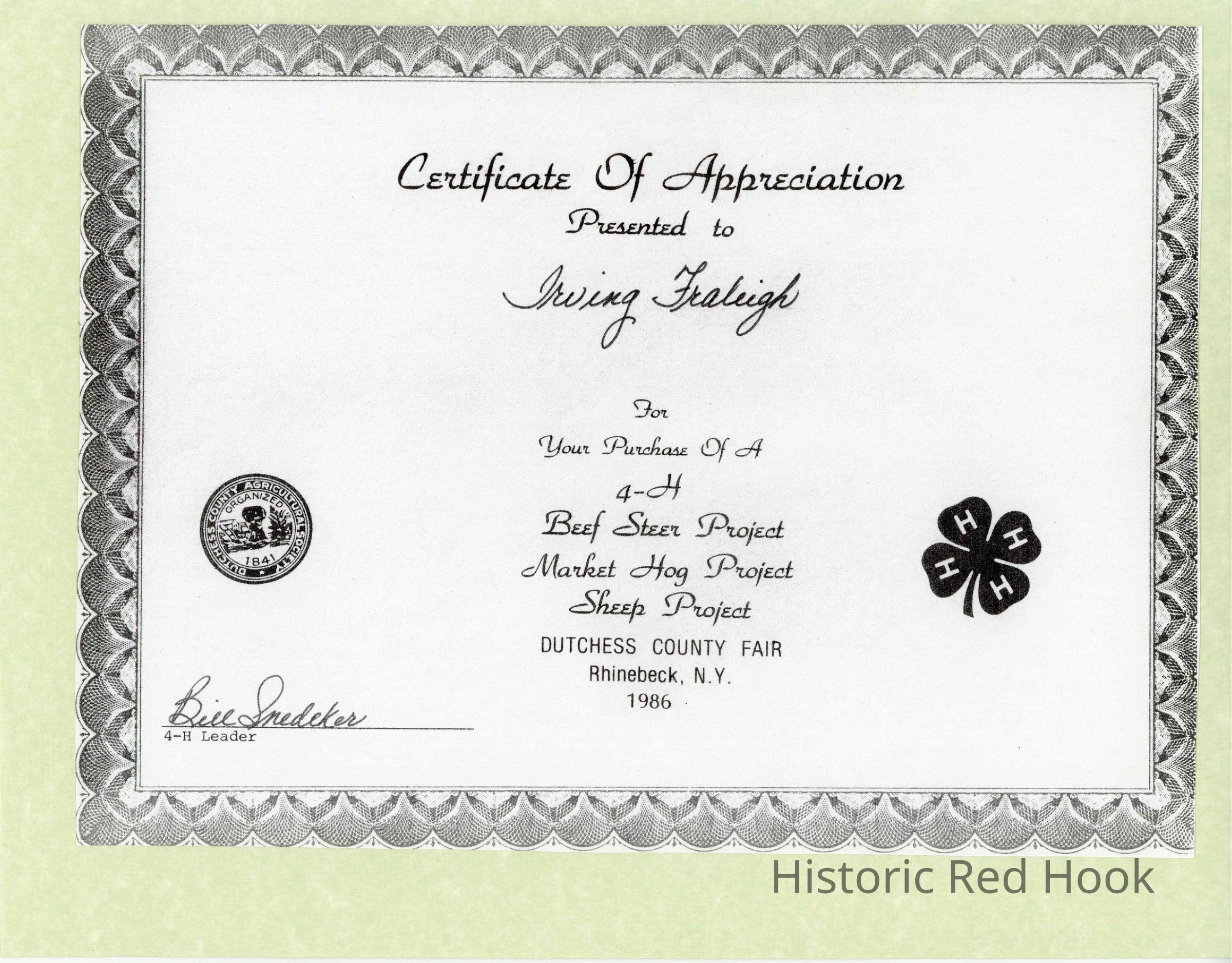 Dutchess County Fair certificate for purchase of 4-H Beef Steer, Market Hog and Sheep projects, Irving A. Fraleigh, 1986