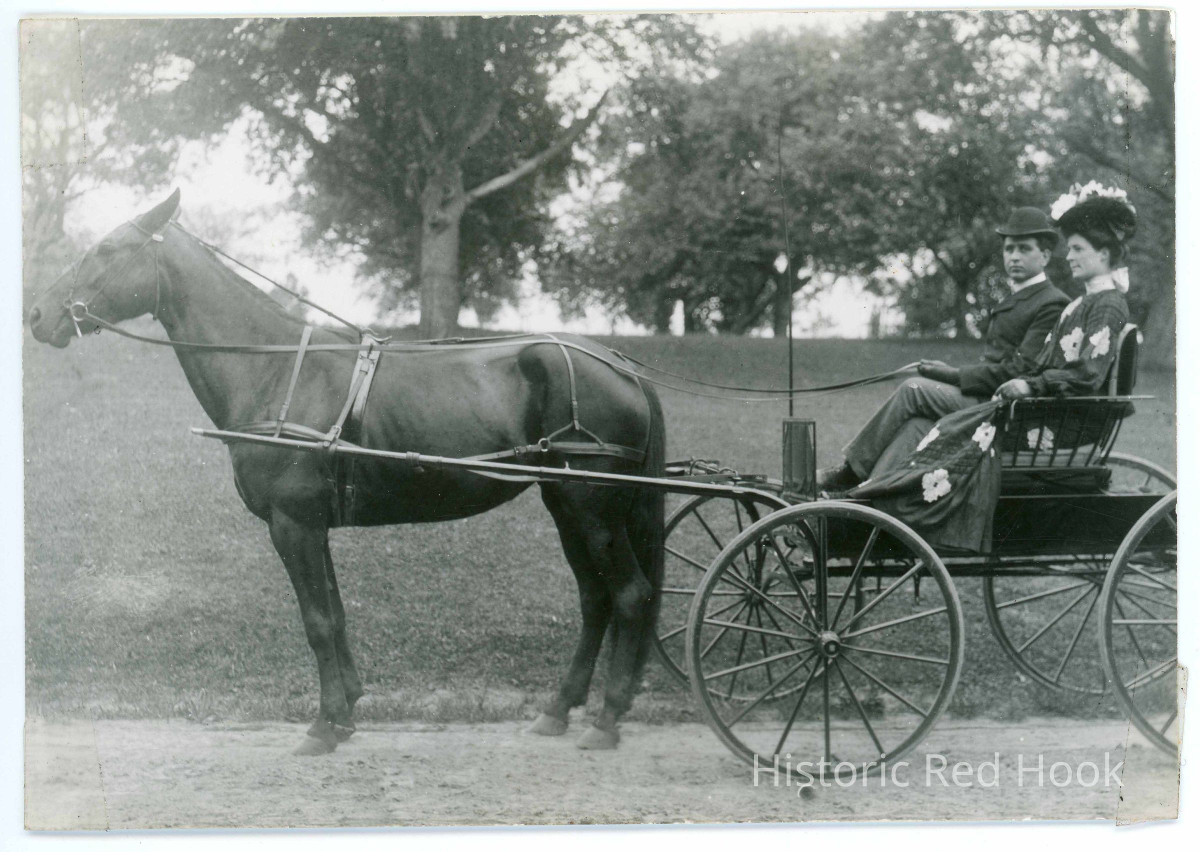 An outdoor photograph of a man and woman seated in a horse drawn buggy identified as E. DoylePhotograph Details