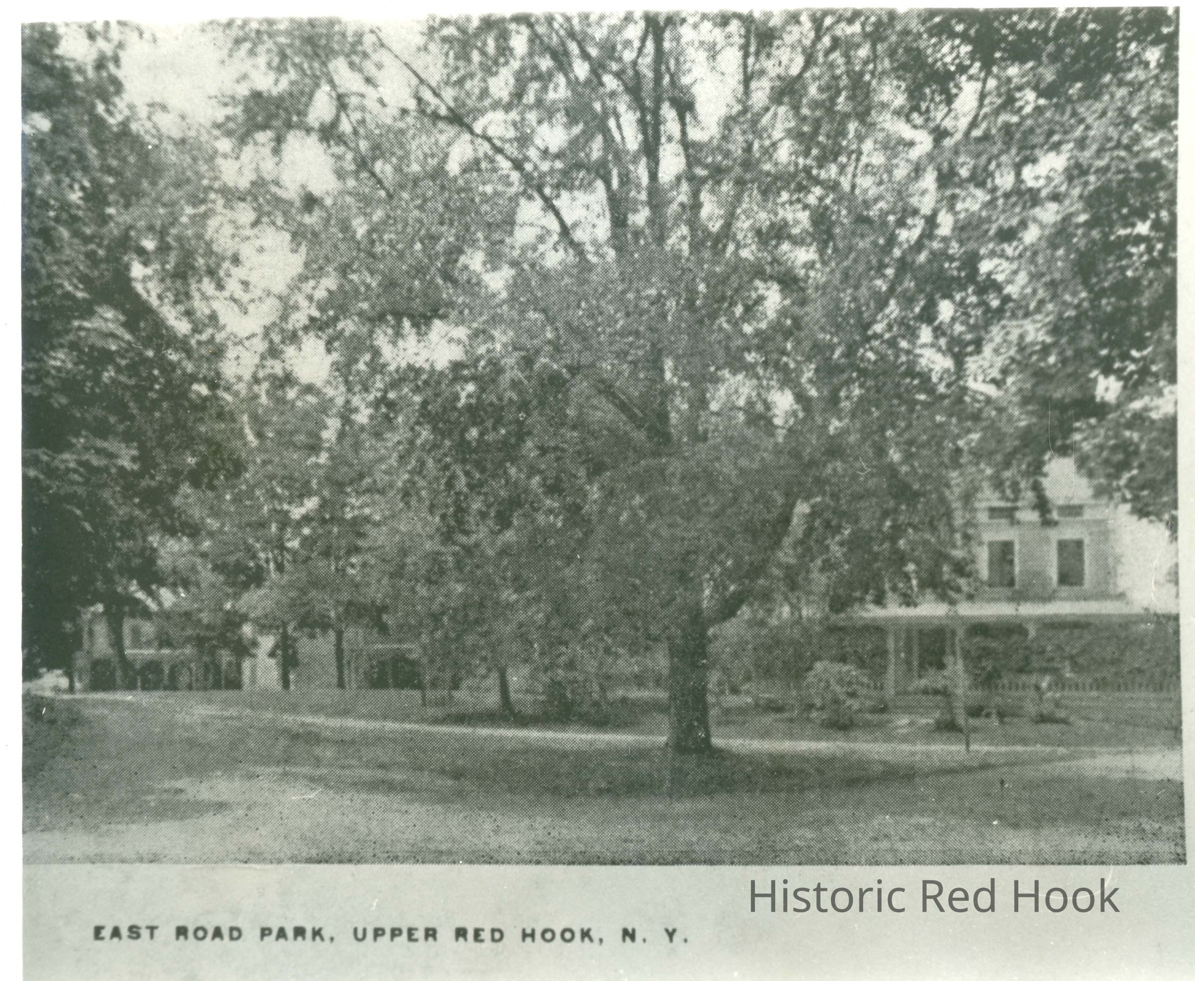 Scene of village green with houses in the background, marked 'East Road Park, Upper Red Hook, N.Y.'