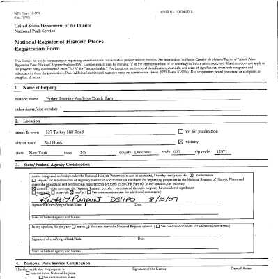 Photos and nomination form on file with the National Register of Historic Places for the Parker Training Center Dutch Barn, 2007Collection