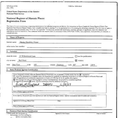 Photos and nomination form on file with the National Register of Historic Places for the Hendrick Martin House, built 1750-1770, in the Town of Red Hook, and designated in 2007.Collection