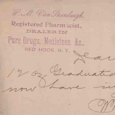 A postcard addressed to Mrs. W. S. Teator, Upper Red Hook, dated February 11, 1896 from W. M. Van Steenburgh, Registered Pharmacist, Red Hook, N.Y. notifying her of bottles in stock.Relationships