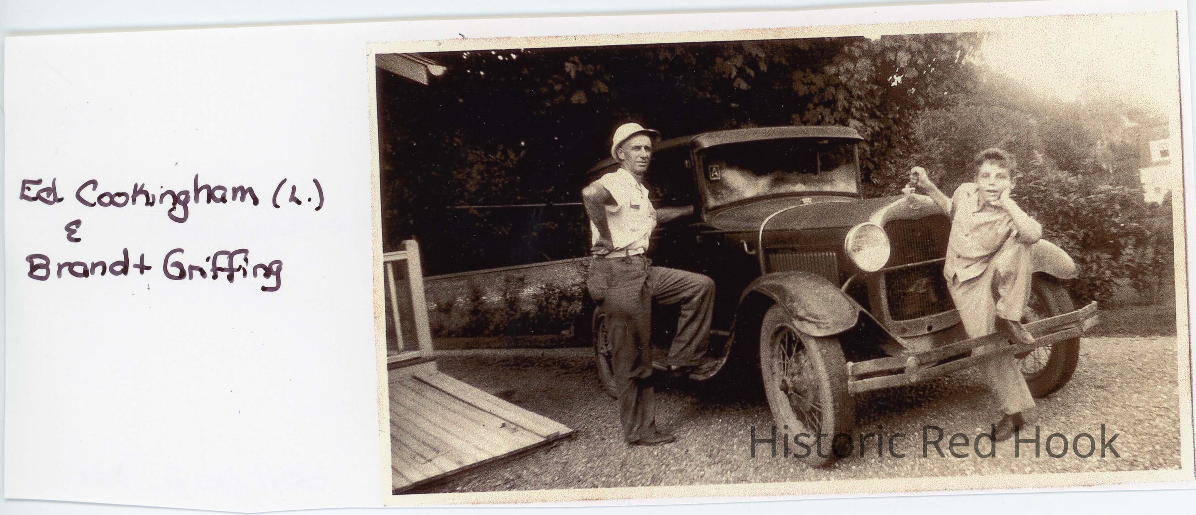 Black and white photograph of Ed Cookingham (left) and Brandt Griffing (son of Raymond & Lillian Griffing, b 1937) leaning on car.Photograph Details