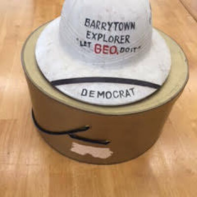 2 pith helmets, 1 white, 1 beige. with writing. Democrat. Buck a year. Dutchess. Barrytown Explorer. George Whalen. Barry Goldwater. Chanler Chapman. Letting George do it, meant passing the buck.