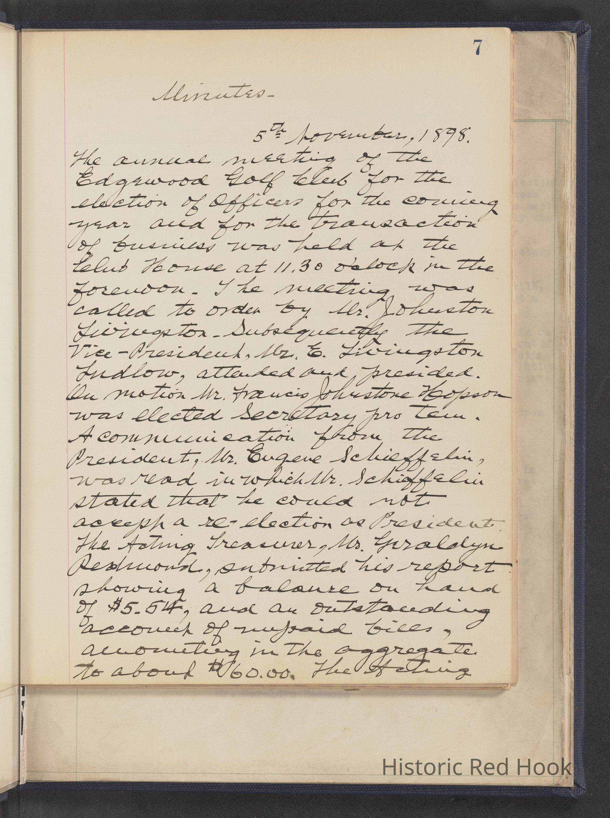 Earliest records of the Edgewood Club of Tivoli, including three Minute Books (1898-1927, 1927-1947, and 1947-1954), two Account Ledgers (1924-1939, 1939-1949), and one guest register (1924-1956). Physical records at FDR Library, digital images stored on HRH computer shared drive.Relationships