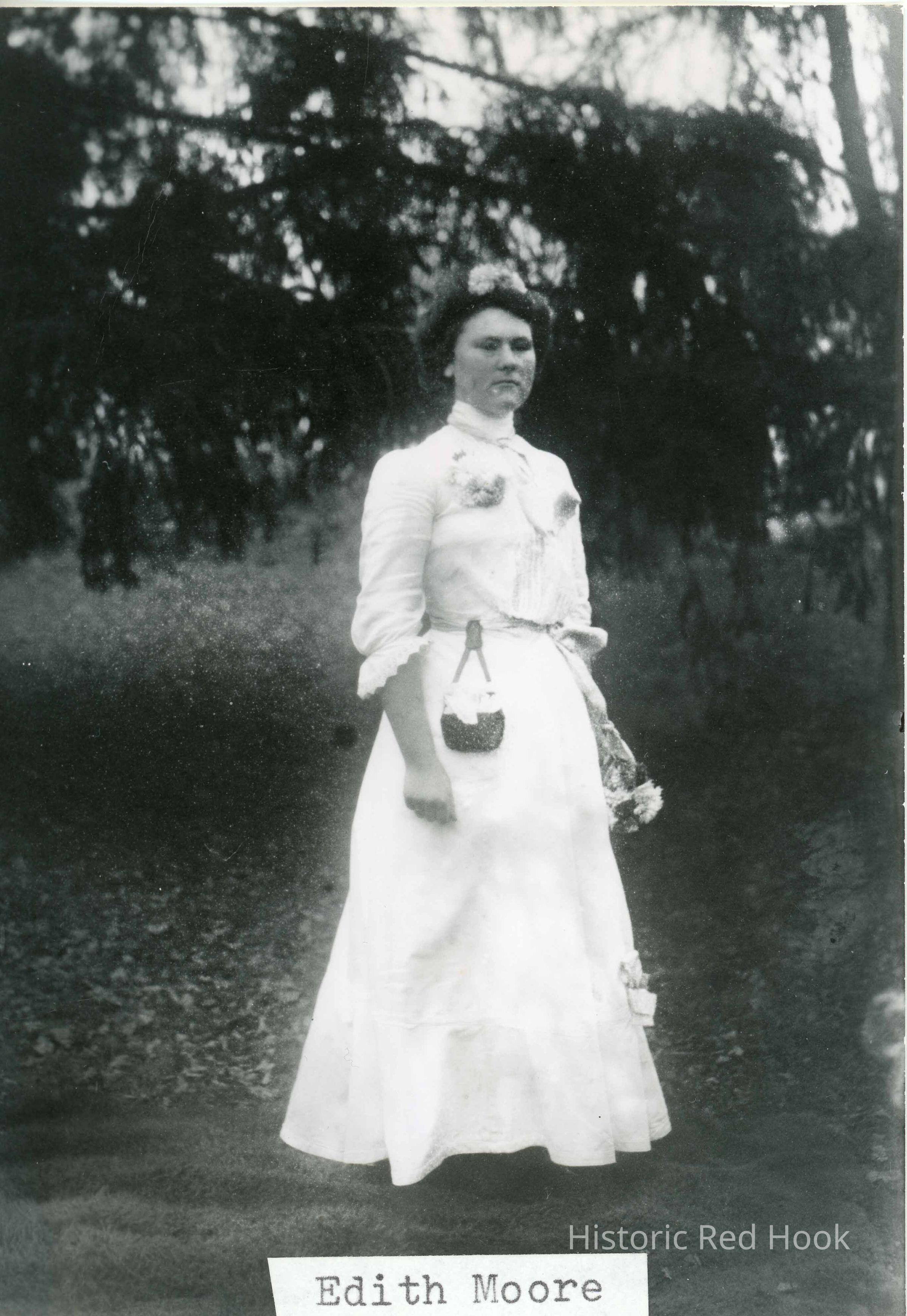 Image of a young woman posed outdoors standing near trees idetified as Edith Moore. WS Teator glass plate negative reversed #14 Misc 2014.008.275Photograph Details
