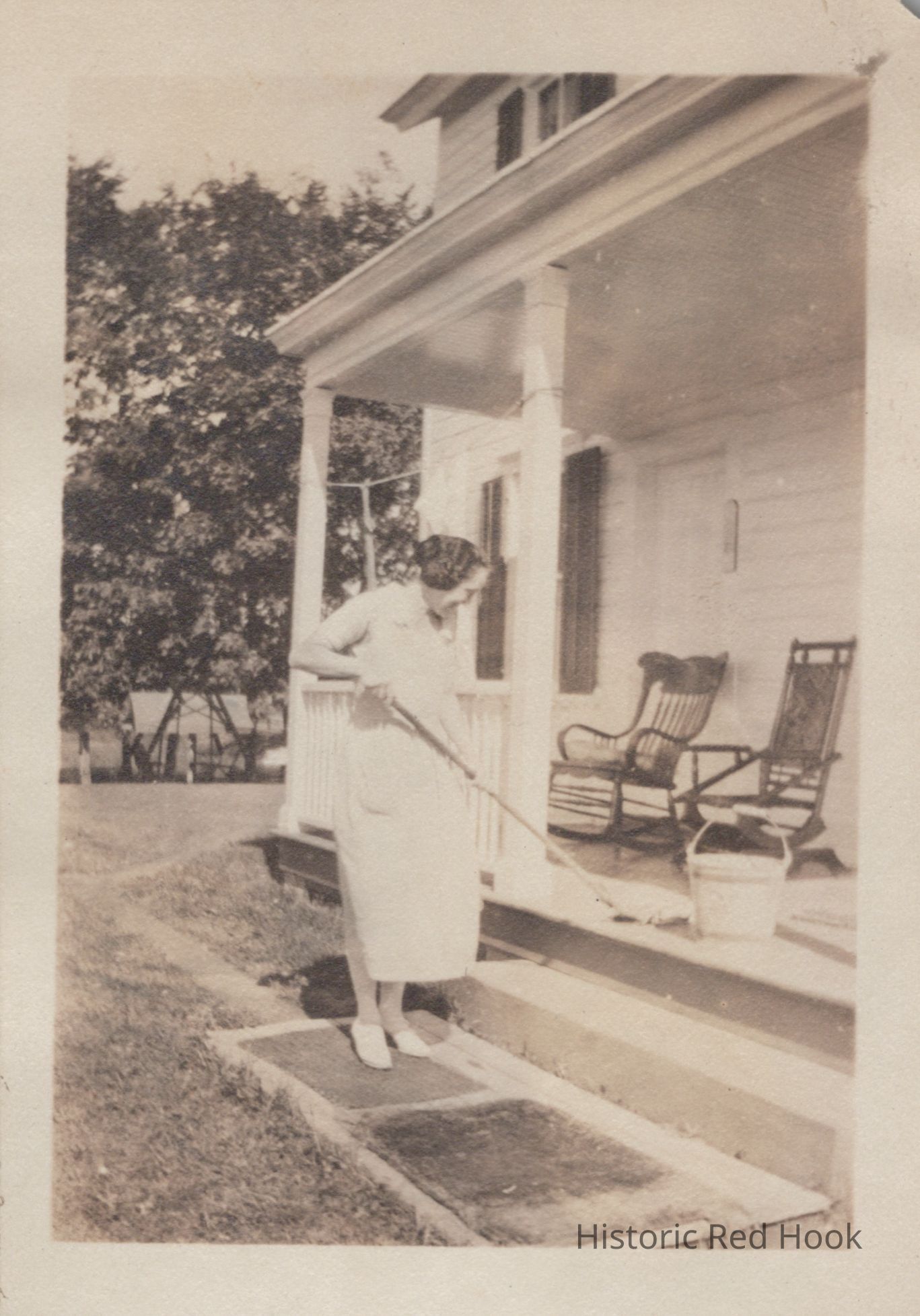 Edna Minkler Stinson mopping porch