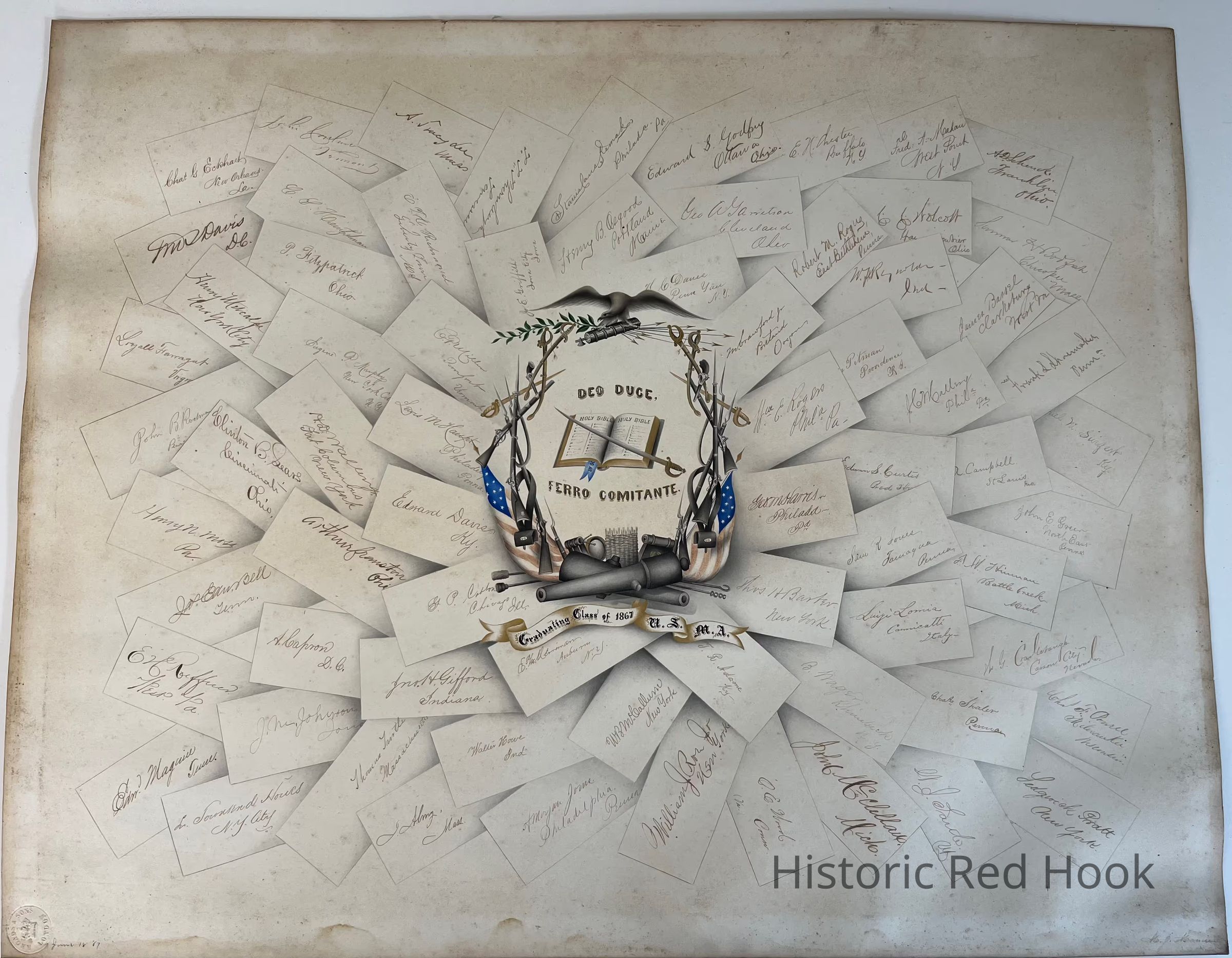 Graduation Certificate with names of 1867 graduates of U.S.M.A including Edwin S. Curtis, cardboard, names surround colored drawing, 16 1/2” L, 20 1/2” WCollection