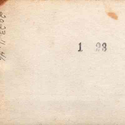 Photo of two men pitching loose hay onto wagon pulled by a team of horses. The name Joe Thomas written on back.Collection