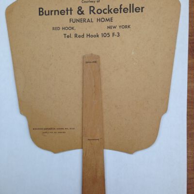 Hand held fan Advertising fan for Burnett and Rockefeller Funeral home, on other side floral vase design.