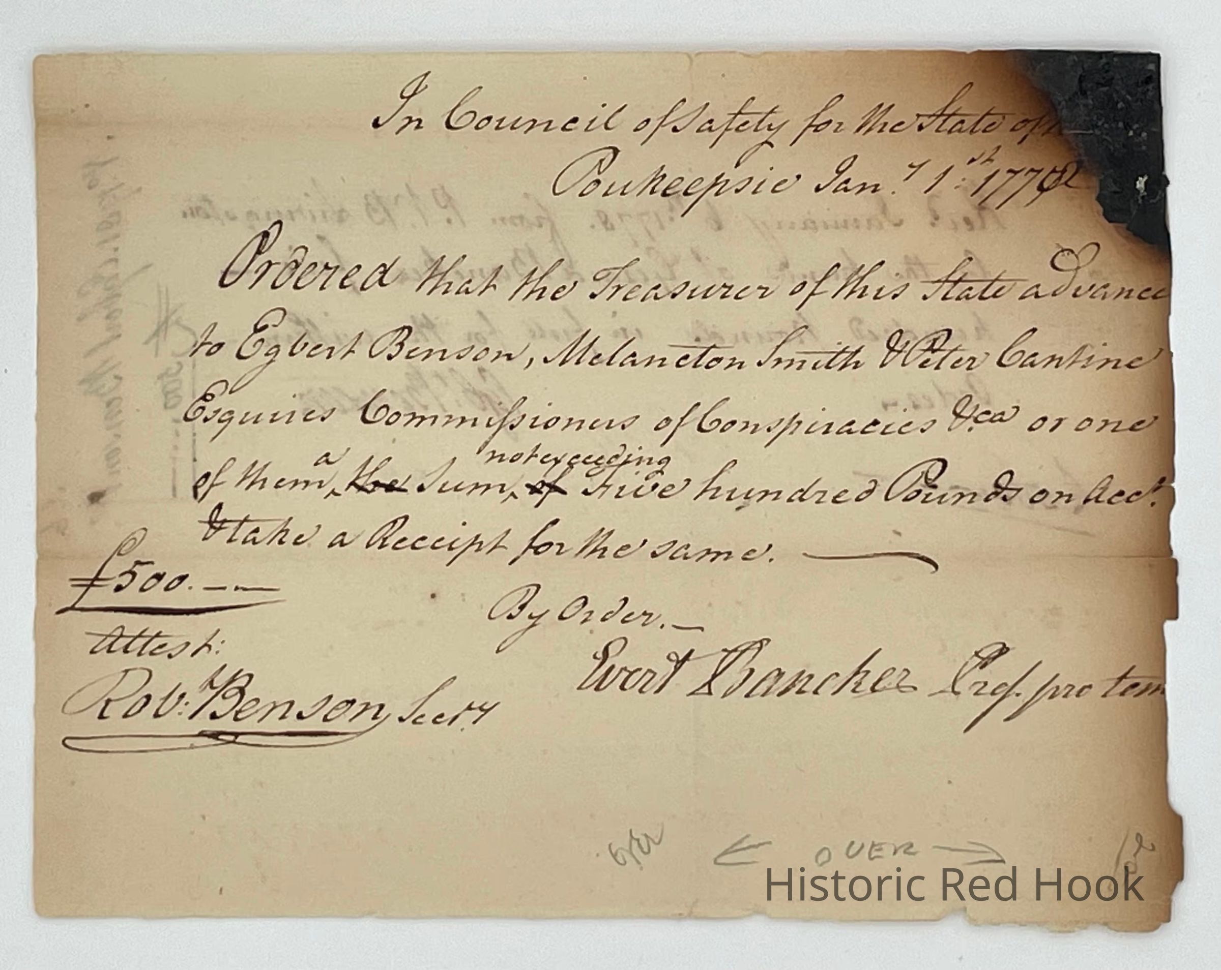 Money order from New York State Treasurer, dated Jan 1, 1778 (?) for advance to Egbert Benson, Melancton Smith & Peter Cantine, Esquires, Commissioners of Conspiracies..." and attached receipt for 500 pounds signed by Egbert Benson and dated January 6, 1778.Relationships