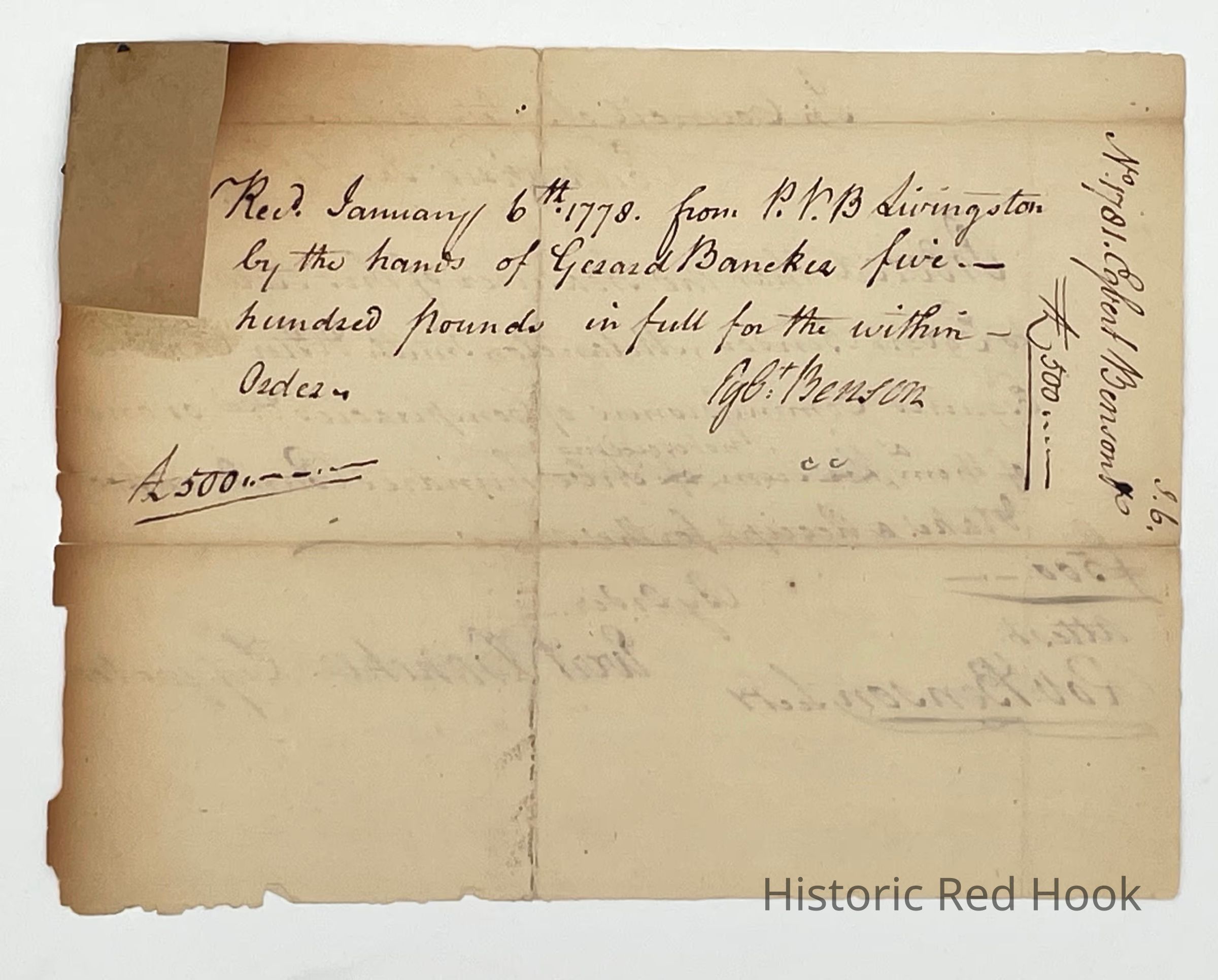 Egbert Benson Receipt for 500 pounds (1778)Entry/Object ID