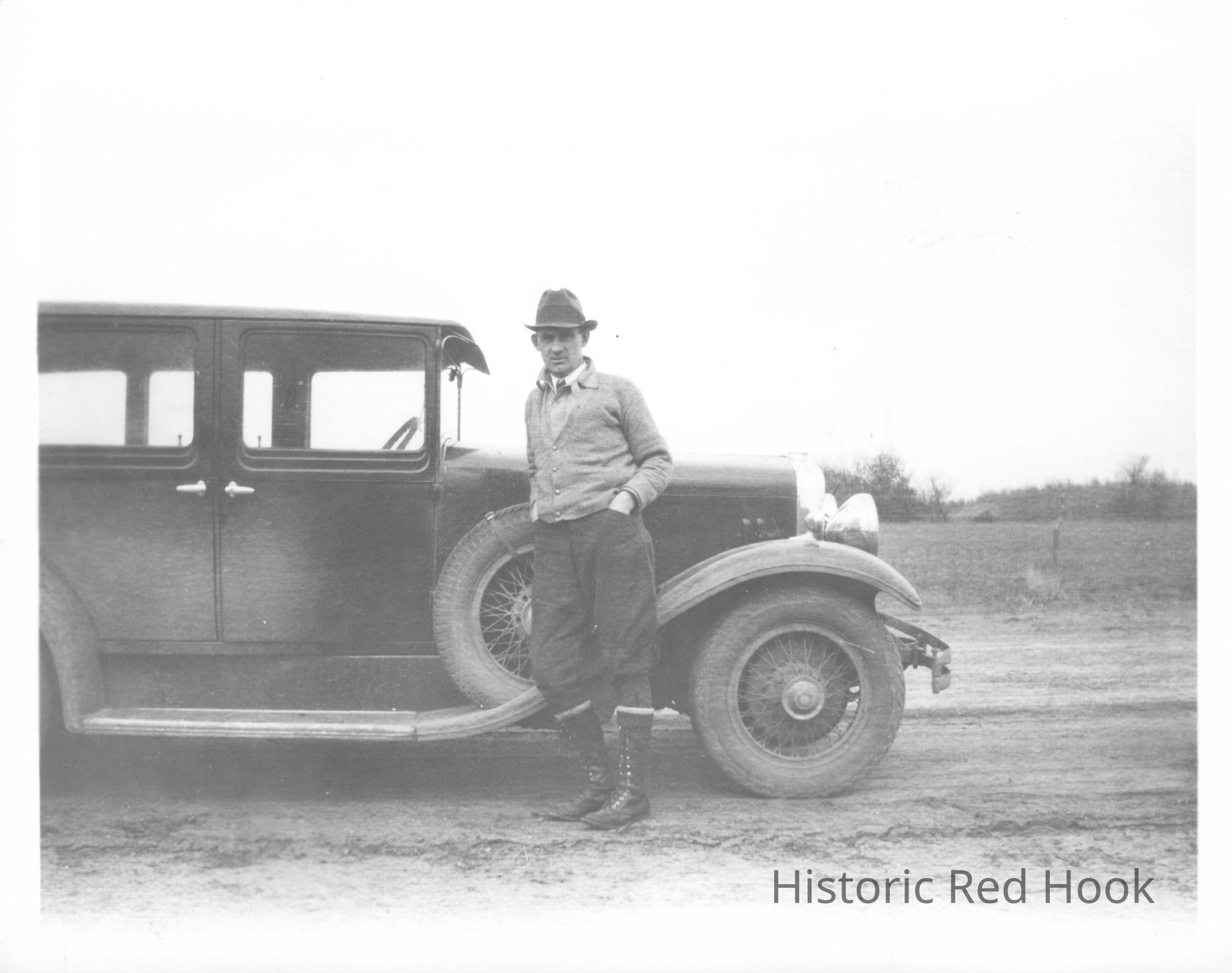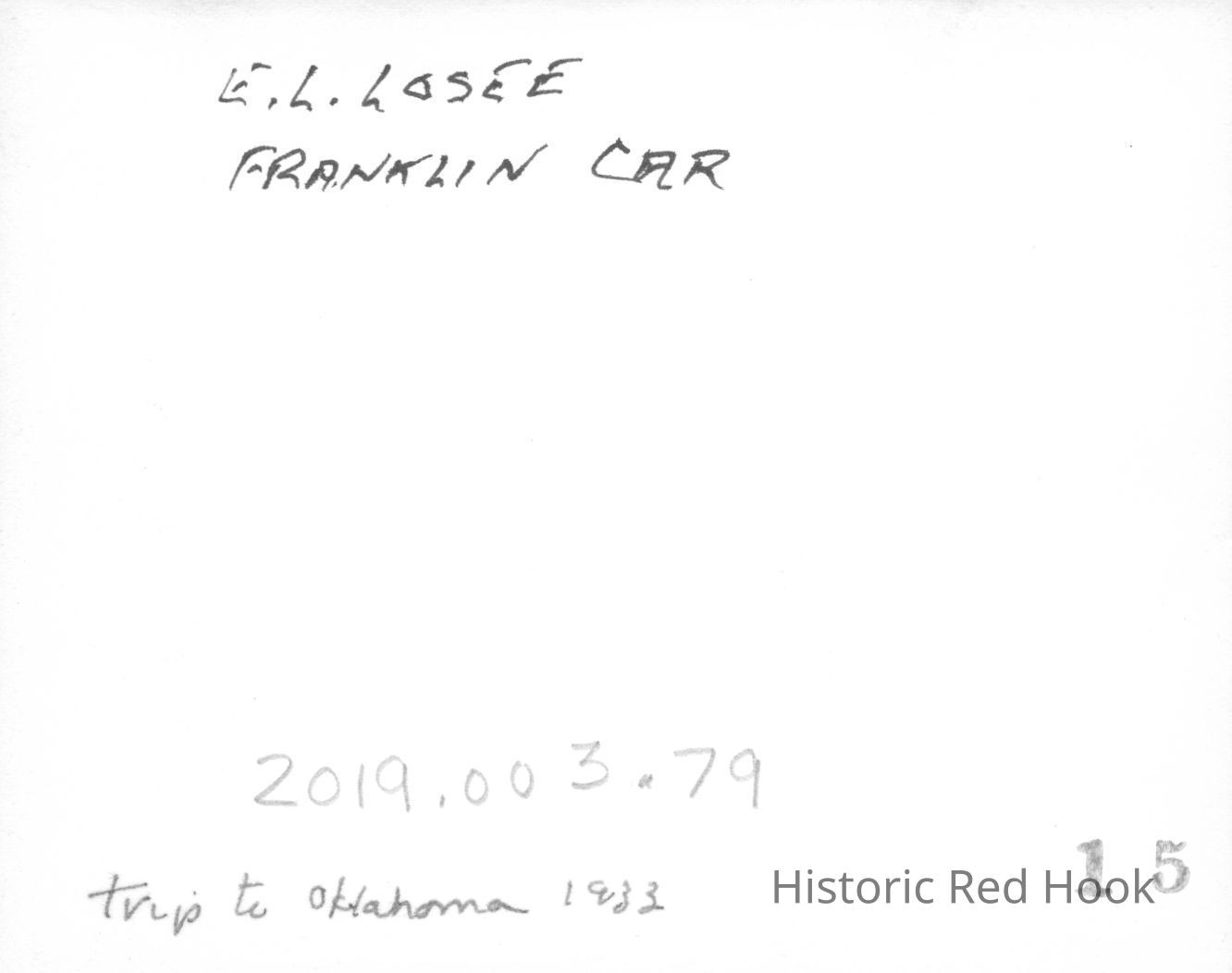 An informal photograph of EL Losee standing beside a Franklin car on a trip to Oklahoma ca 1933.