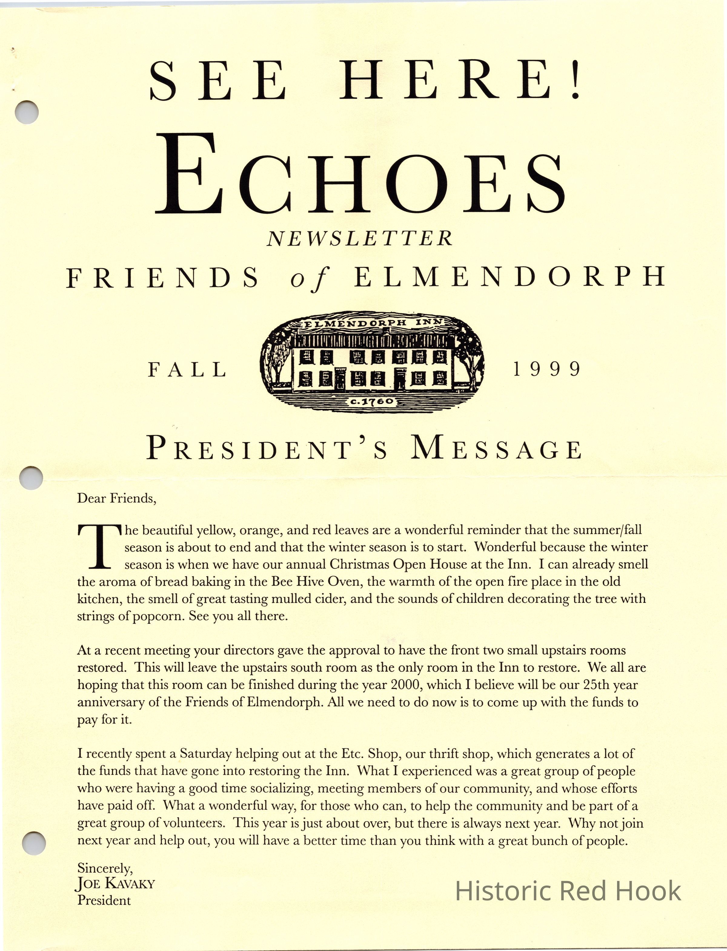 Newsletter created for the membership of the Friends of the Elmendorph.