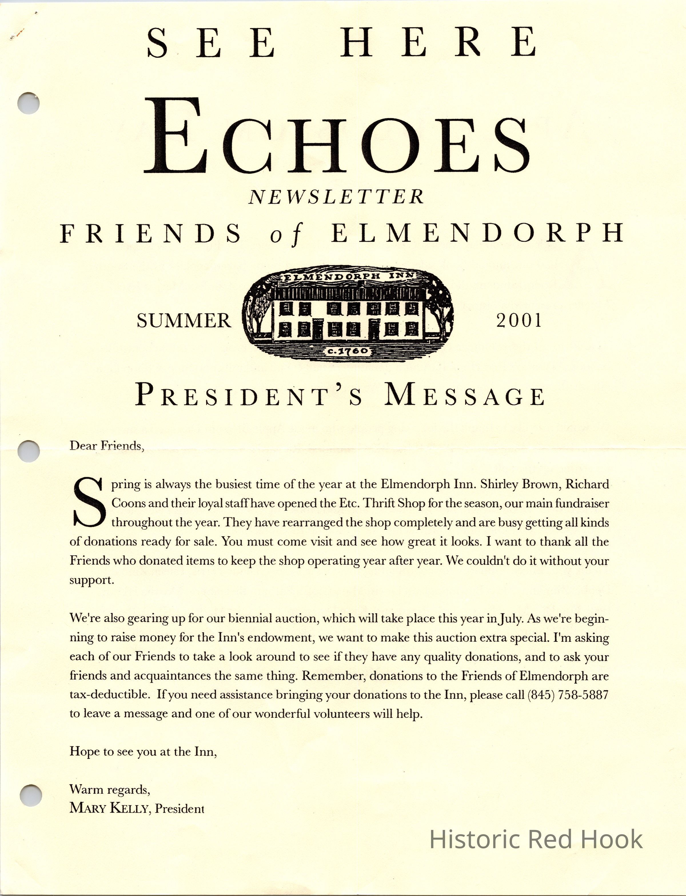 Newsletter created for the membership of the Friends of the Elmendorph.