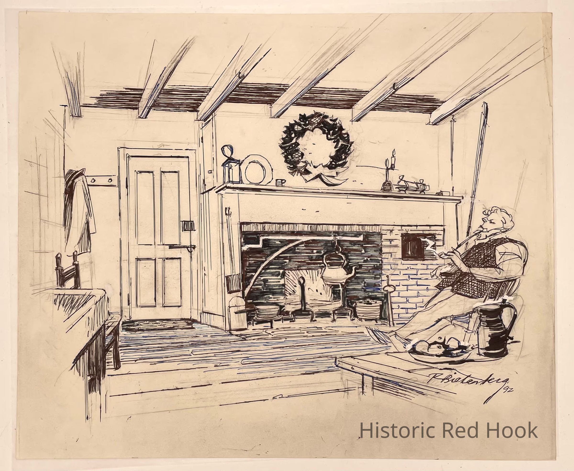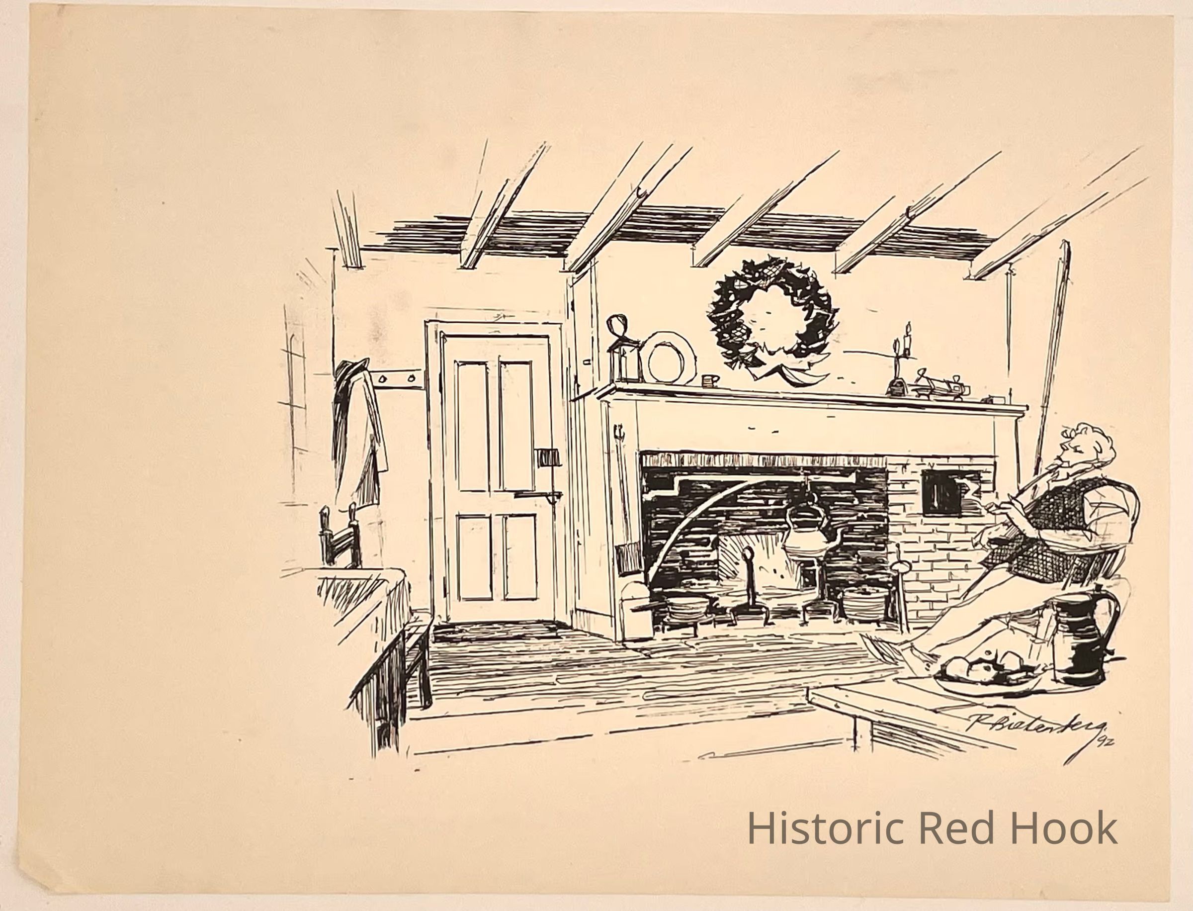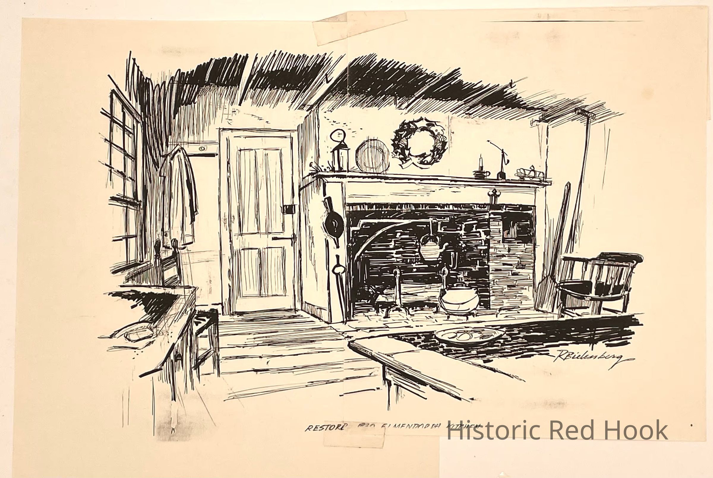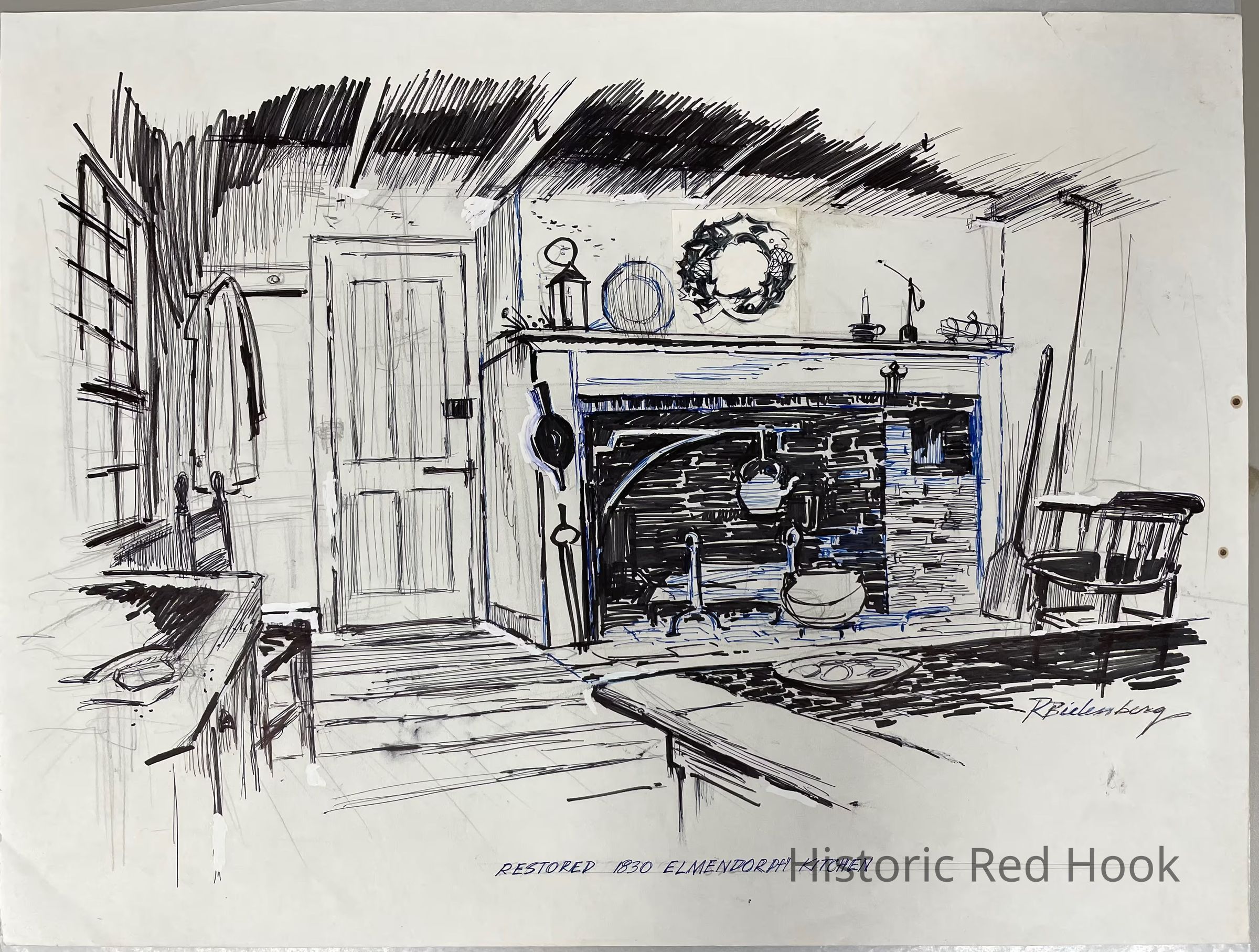 Robert Bielenberg illustration depicting the Elmendorph Inn's old Kitchen.
