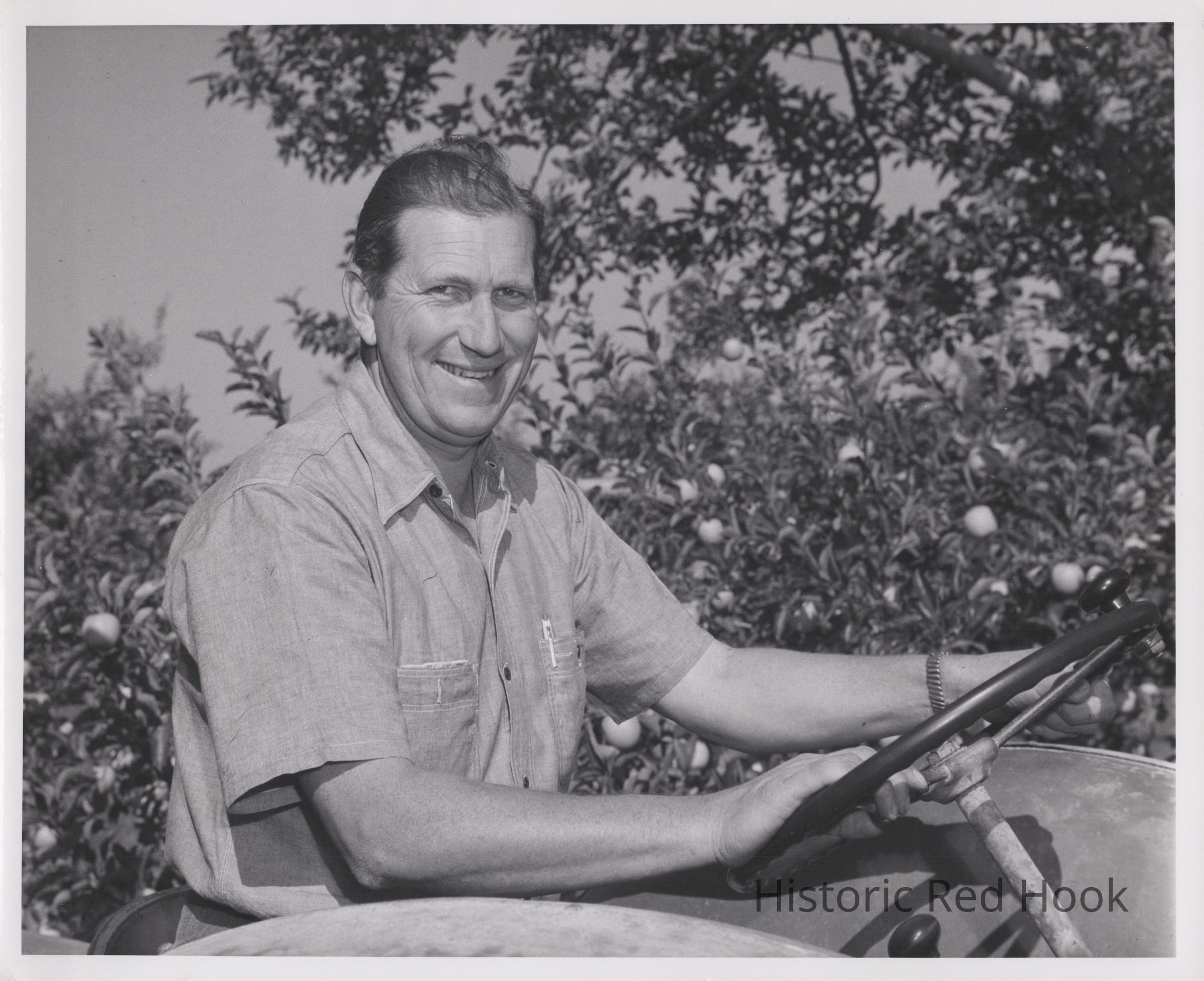 A photograph of Elmore Fraleigh seated on a tractor at an orchard possibly located in California ca. Sept 1957.Photograph Details