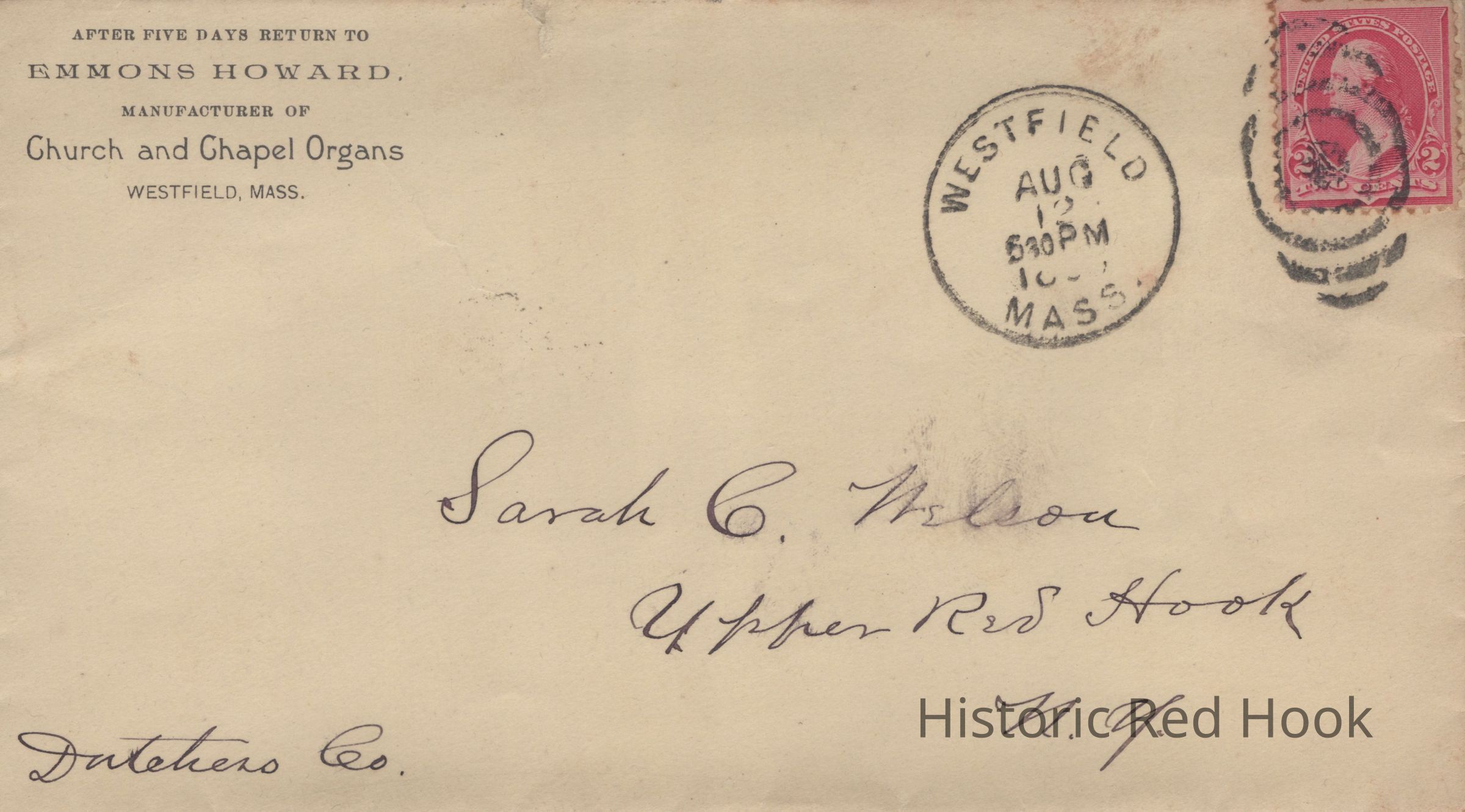 Envelope from Emmons Howard, manufacturer of Church and Chapel Organs, Westfield, Mass. addressed to Sarah C. Nelson, Upper Red Hook, postmarked Aug. 12, 1893.Relationships