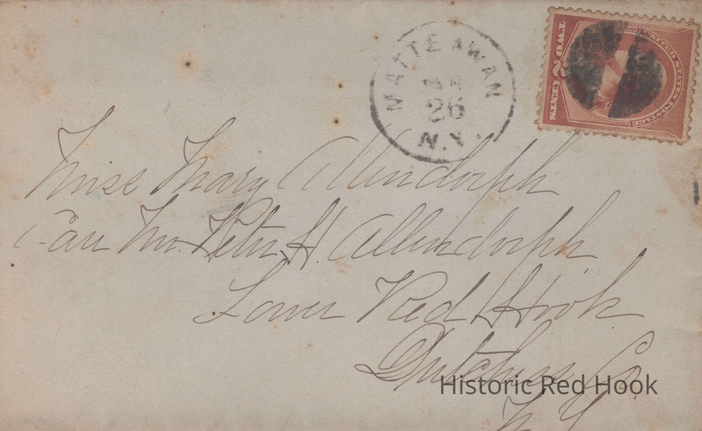 An envelope addressed to Miss Mary Allendorph in care of Mr. Peter H. Allendorph, Lower Red Hook, Dutchess Co. NY, Postmark Mattewan, NY. Peter Henry and wife Margaret Ruth Adams has no children and adopted a daughter, Mary.Collection