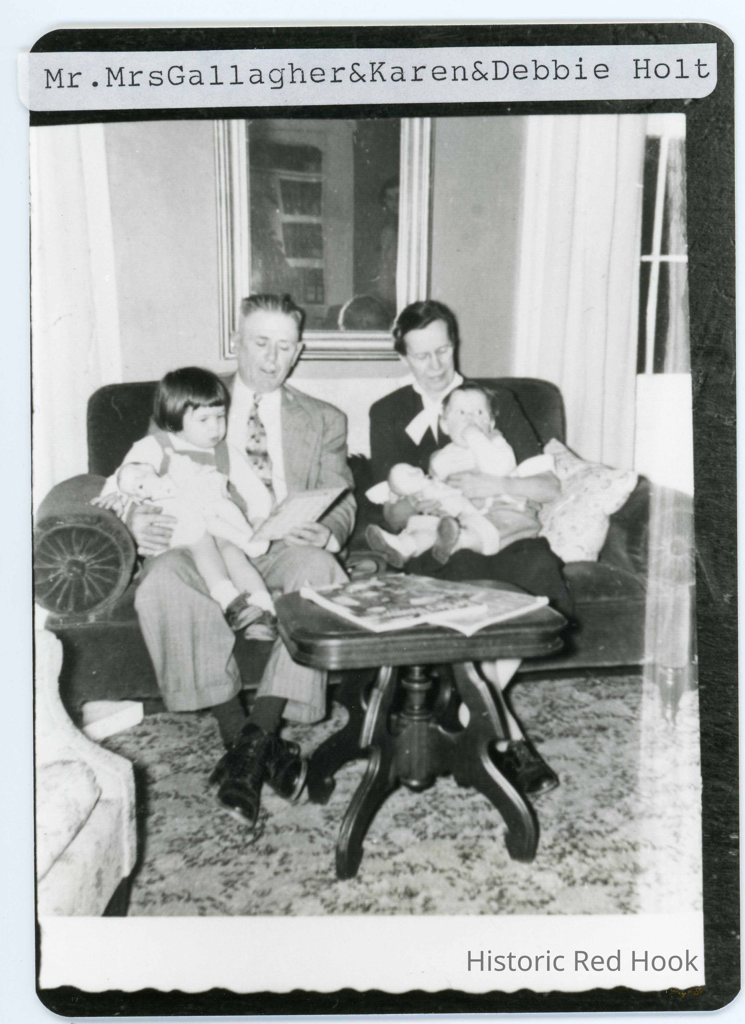 Informal image of a man and a woman seated on a couch holding a little girl and a baby. The man and woman are identified as Ethel and Clint Gallagher & Karen and Debbie Holt.Photograph Details