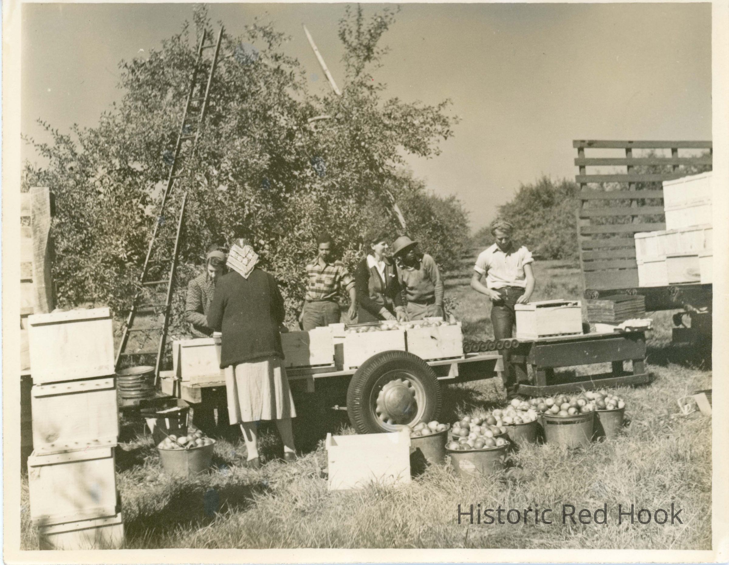 Workers filling crates with apples