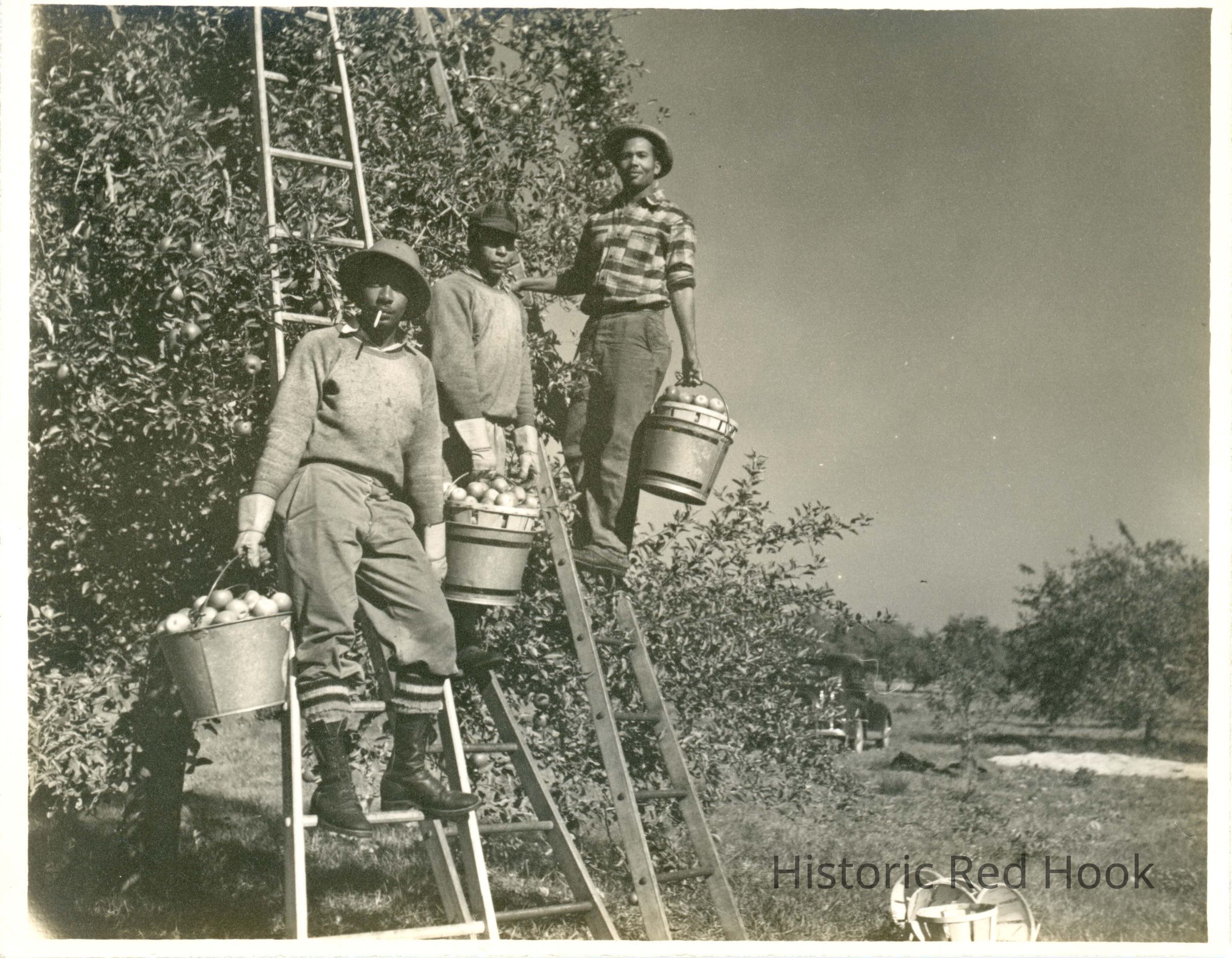 Three men on ladders picking apples