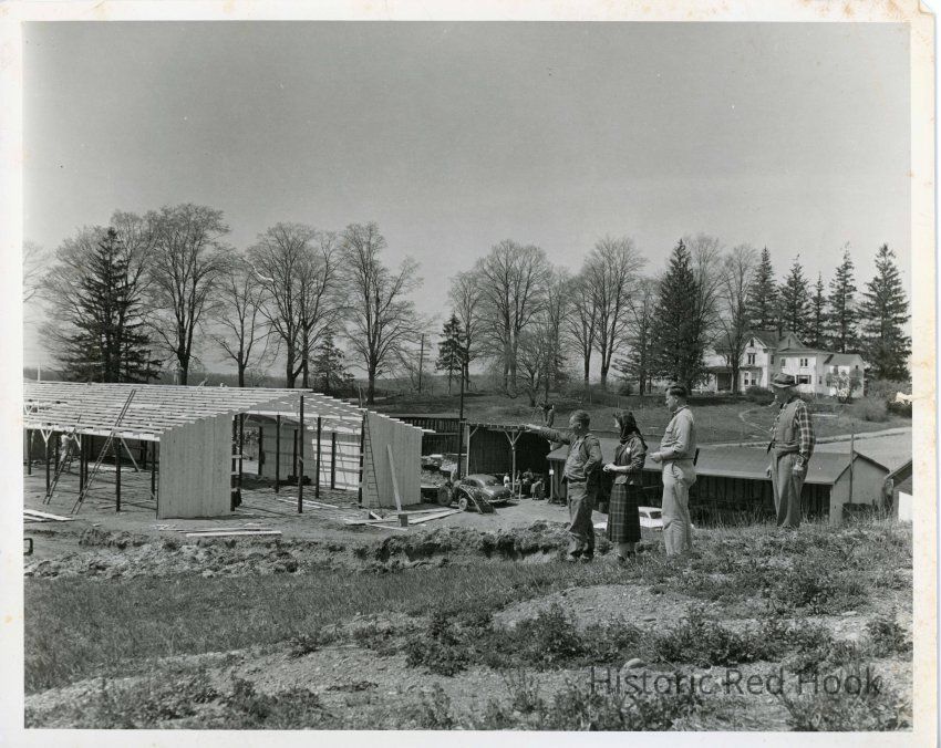Barn-raising on Thomson property.Norm Thompson, Fran Thompson, John Layer and E. H. Thompson (Norm Thompson's Dad) observing work in process.Collection