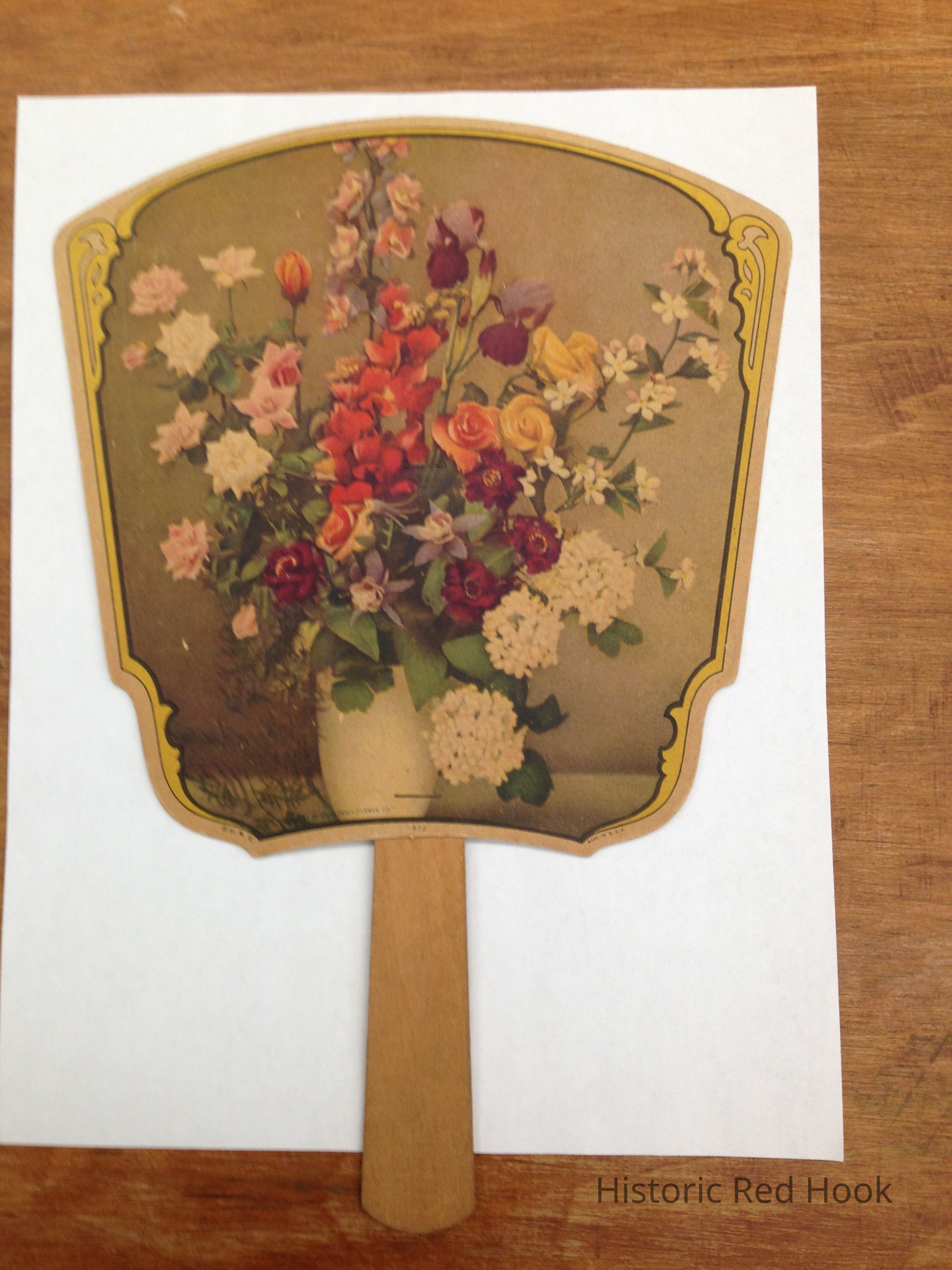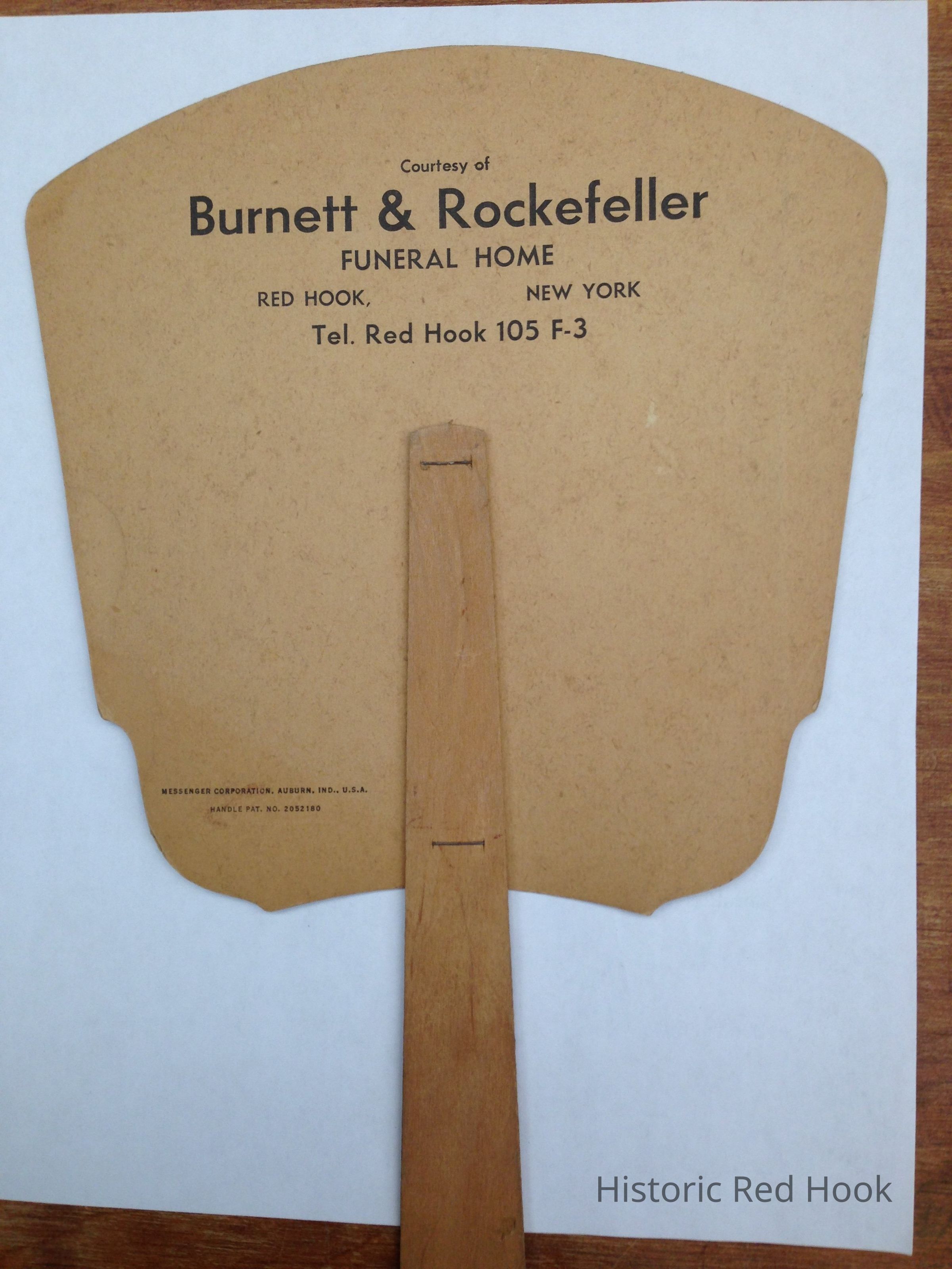 Hand held fan Advertising fan for Burnett and Rockefeller Funeral home, on other side floral vase design.