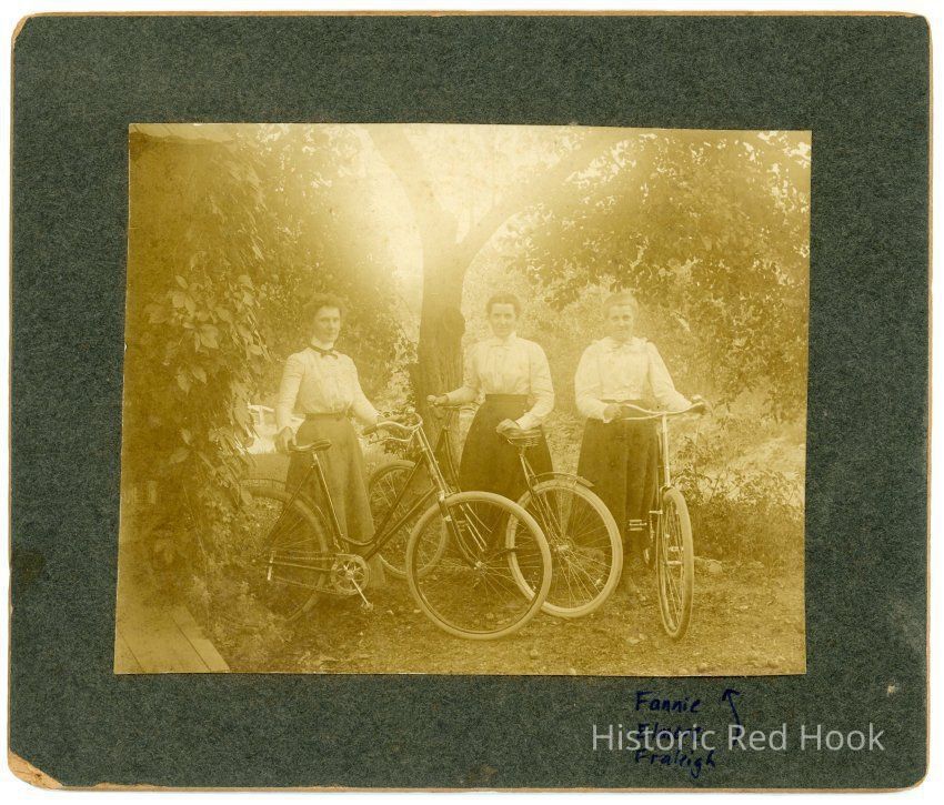 Photo on cardboard, three women standing next to their bicycles