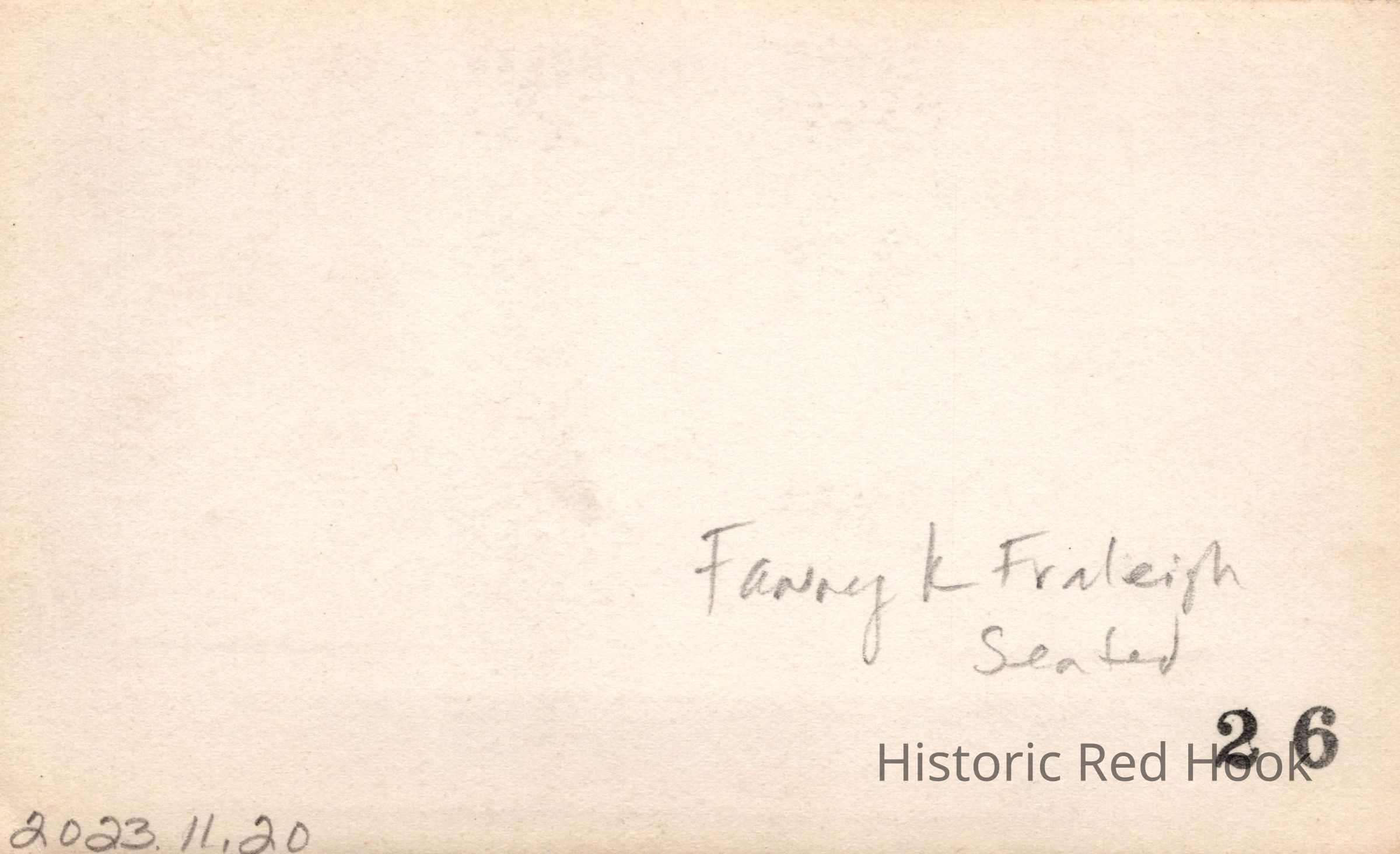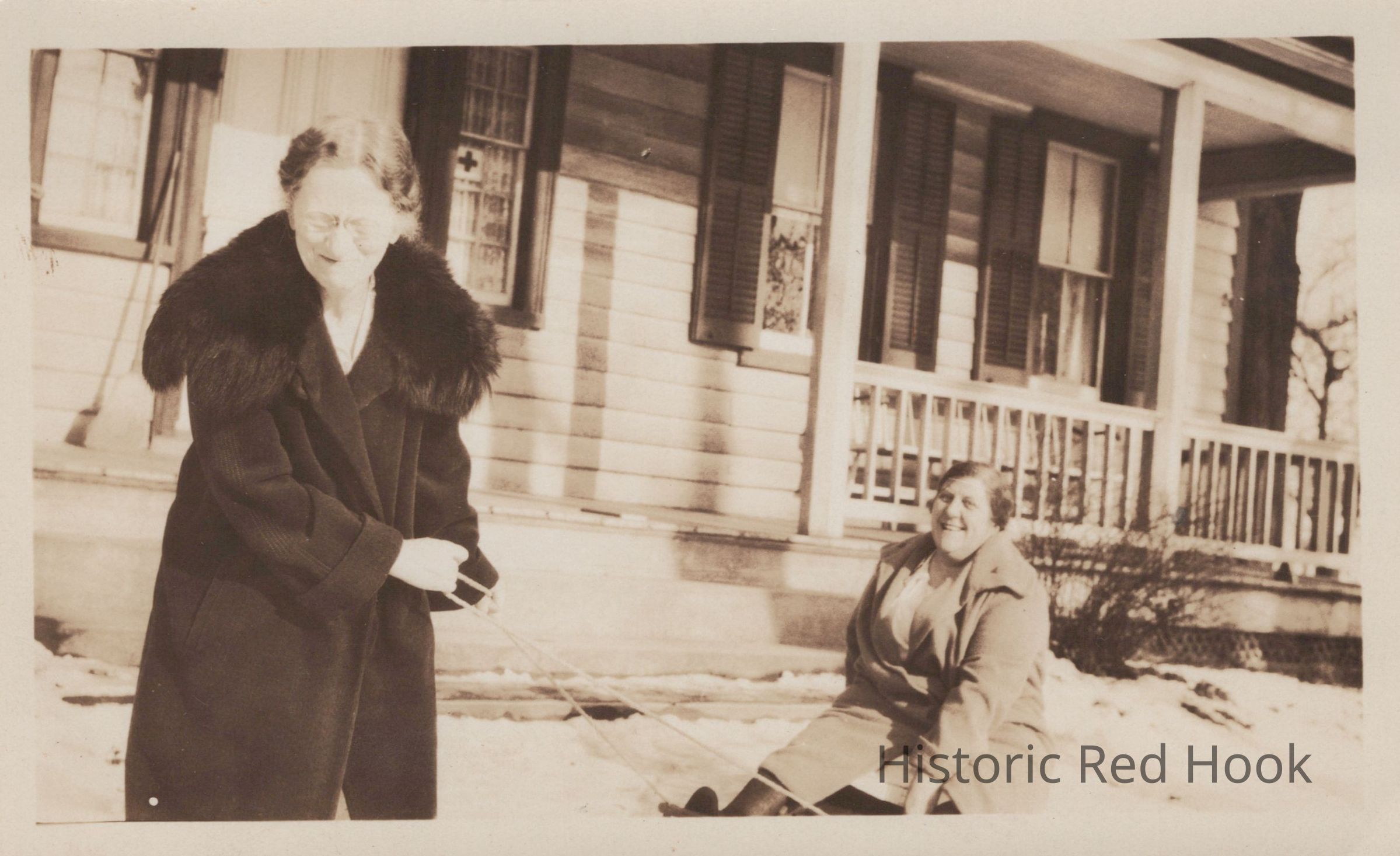 Photo of Fanny K. Fraleigh (seated on a sled) and another woman pulling her, in front of a house.Photograph Details