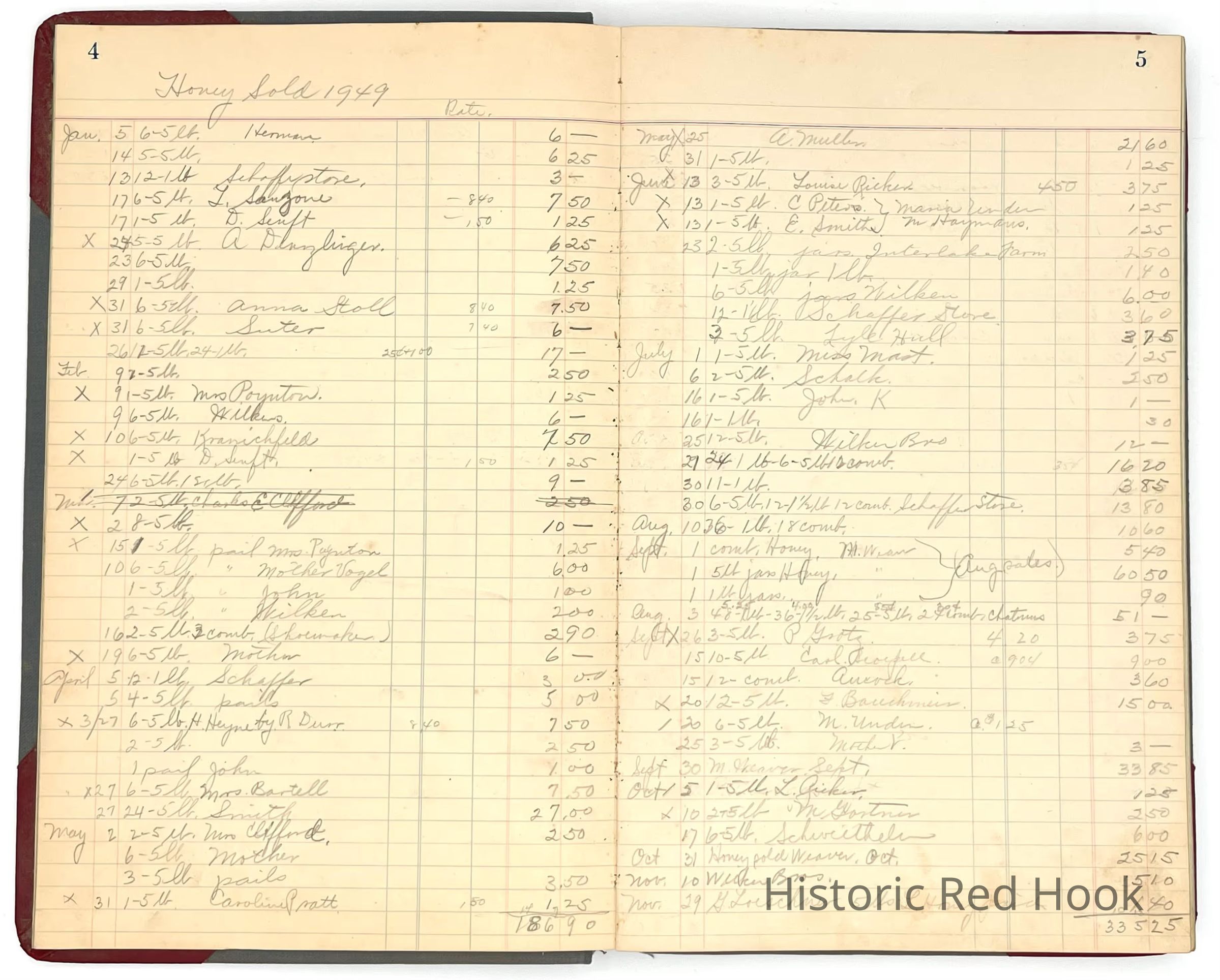 Journal kept by Walter Vogel relating to his farm on Hapeman Hill Road 1949-1951. Includes listings of donations and Contributions; sales of honey, milk, poultry, apples. Listings of expenses include for feed, beekeeping, orchard, farm, labor. Loose letter to Walter Vogel from Vancrest Farm, Nov. 1951, about an order for Hamp pullets.Collection