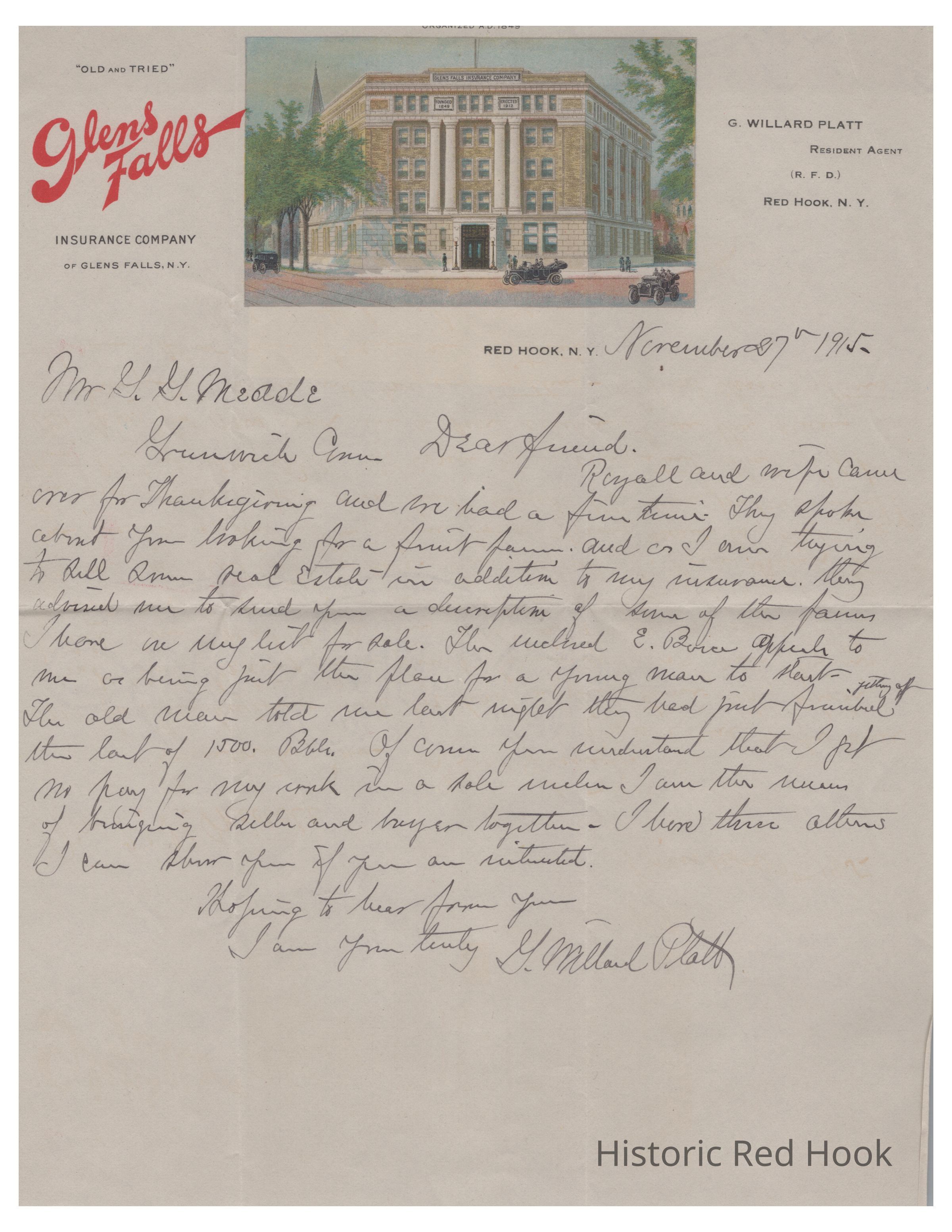 Letters from G. Willard Platt (who sold real estate as well as insurance) to G. Gordon Mead about farms for sale that he might be interested in purchasing, Nov 7, 1915Relationships