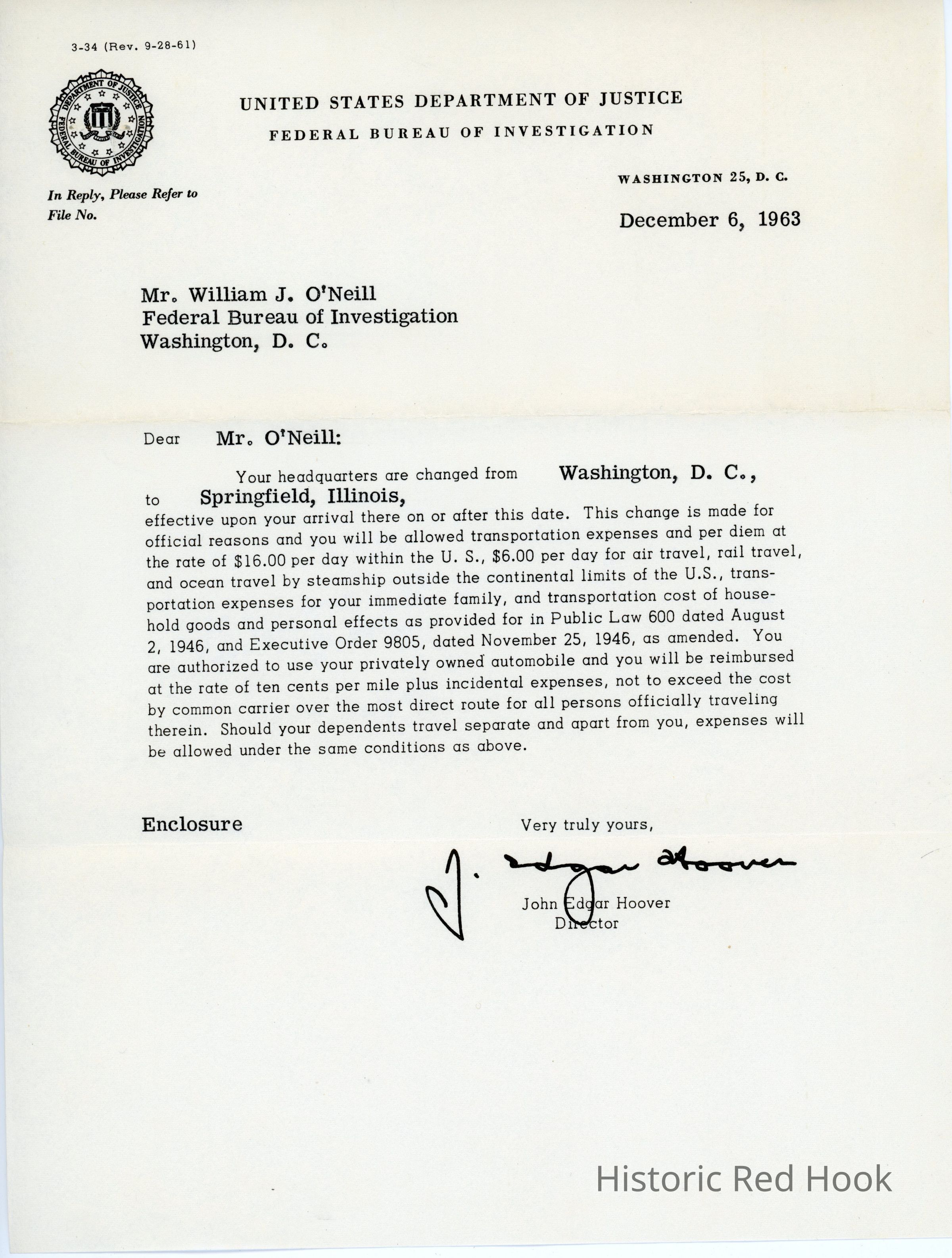 FBI memo from J Edgar Hoover to Bill O'Neill