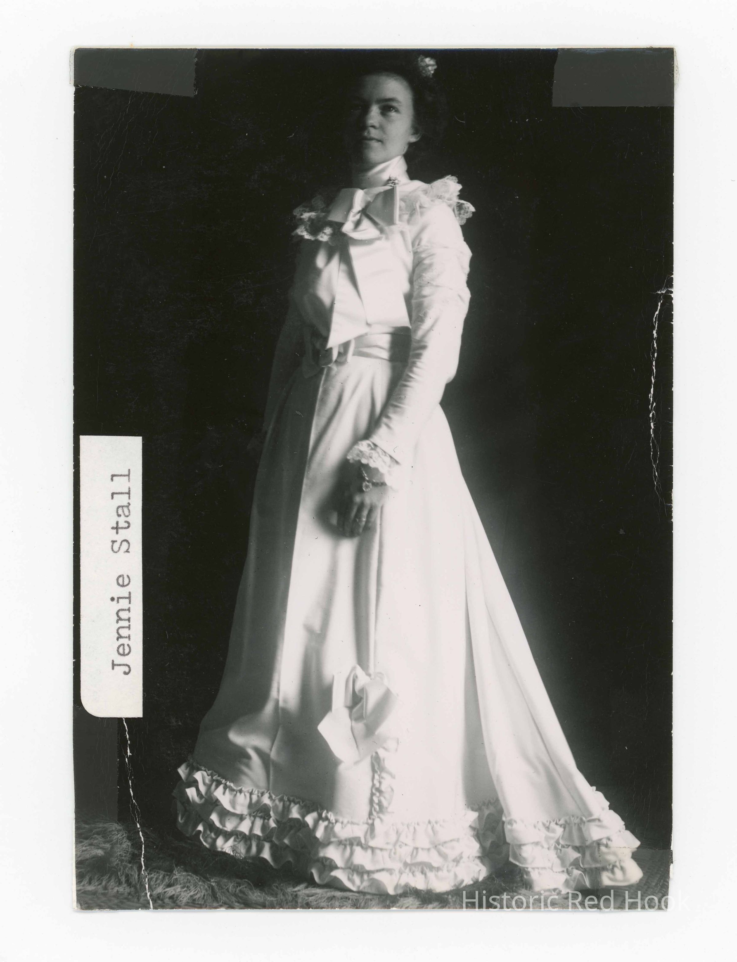 Photo of Jenny Stall standing in wedding dress. Image is from W. S. Teator glass plate negative collection (2014.008.109 is reversed).Photograph Details