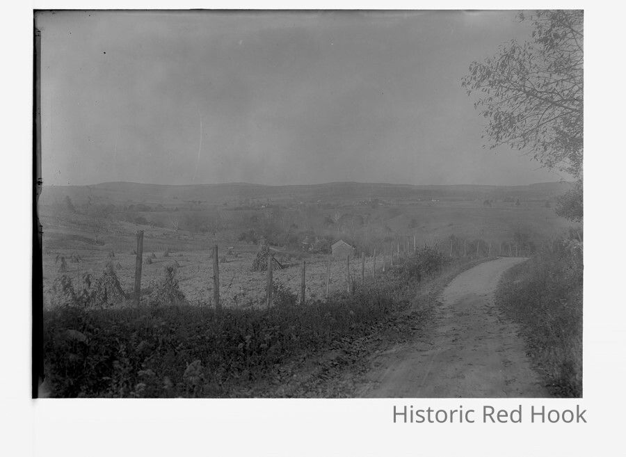 Field with shocks of corn or rye, with a road running down the hill.Collection