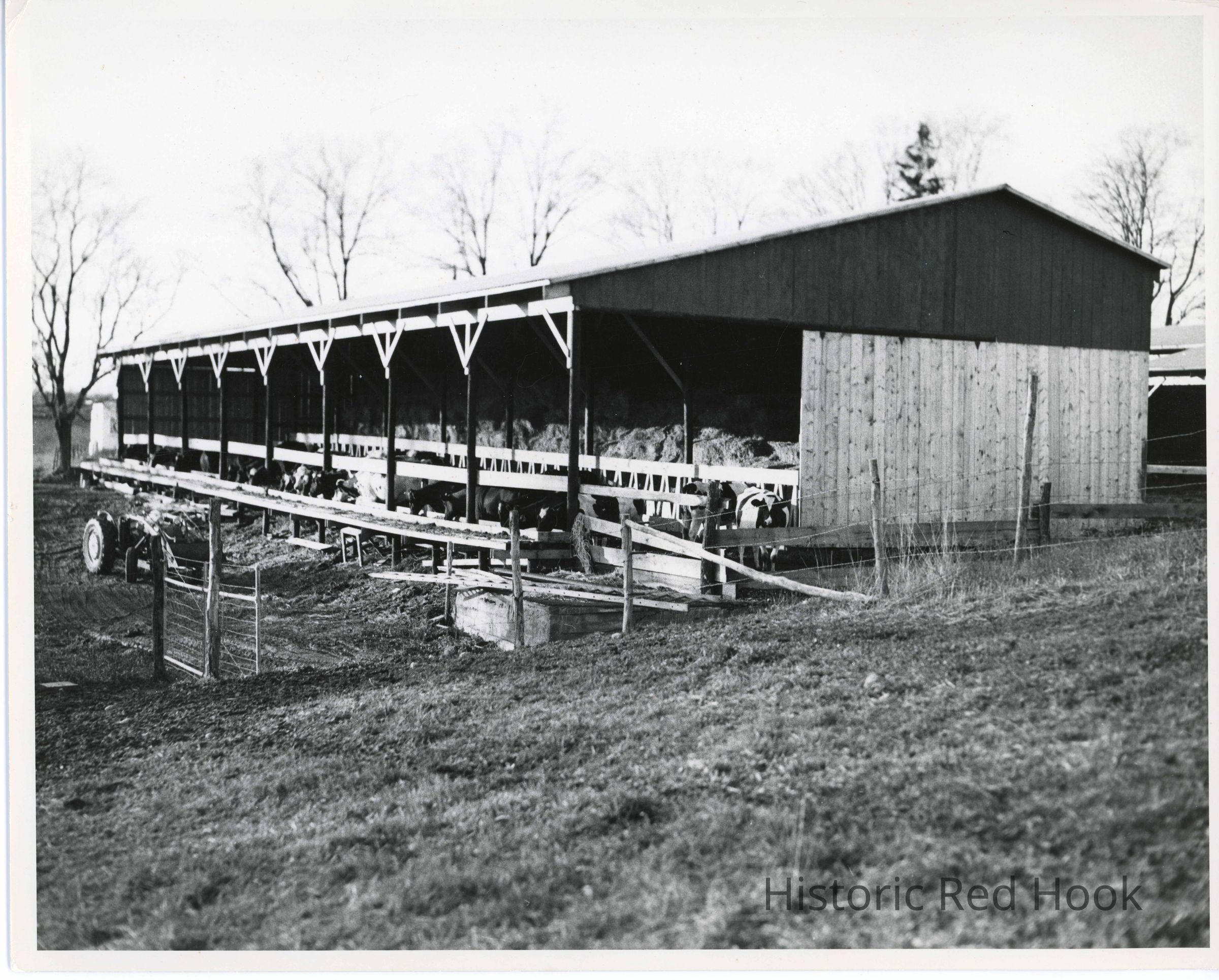 Barn-raising on Thomson property. Finished barn with cows feeding.Collection
