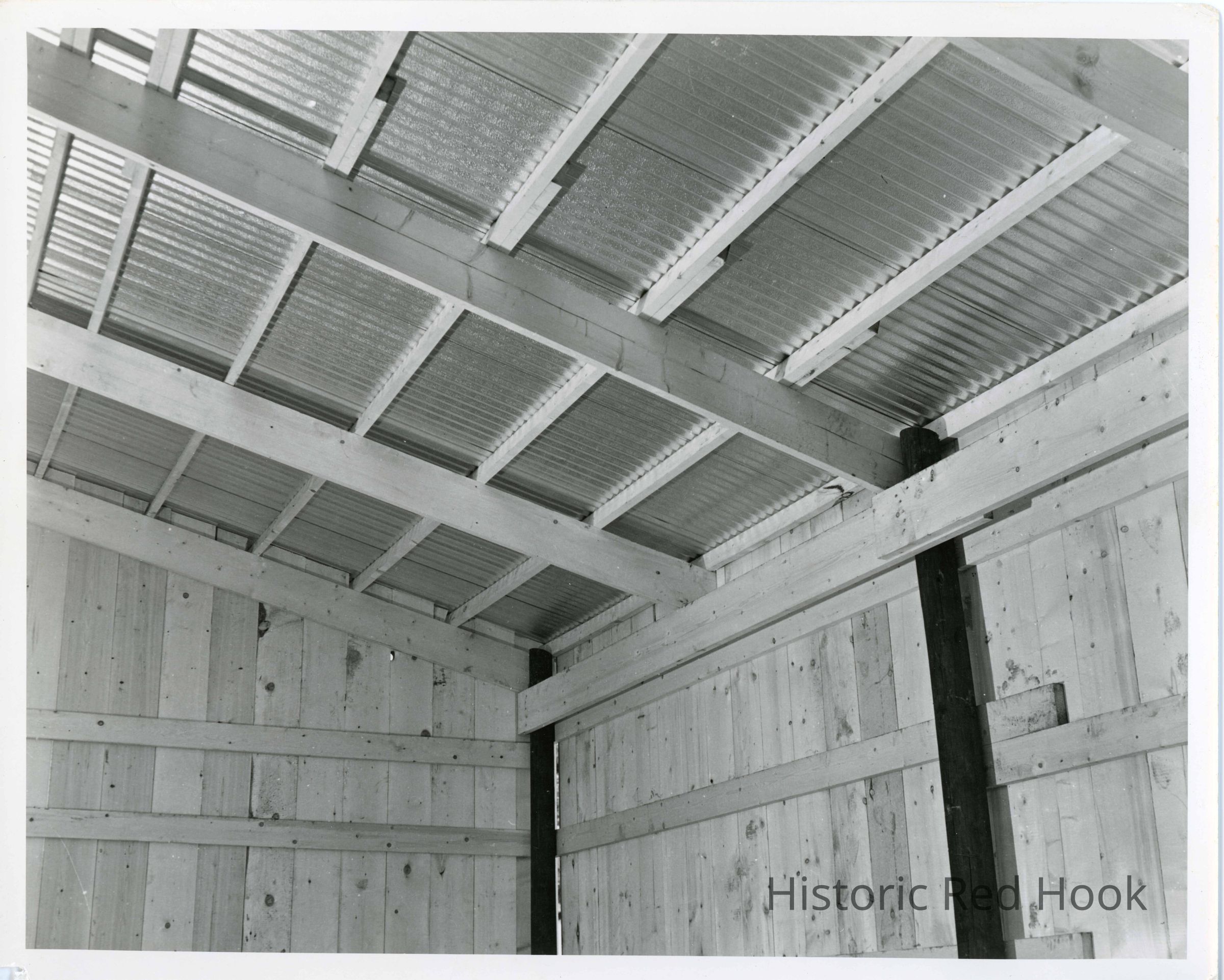 Barn-raising on Thomson property. Looking up at finished corner of barn.Collection