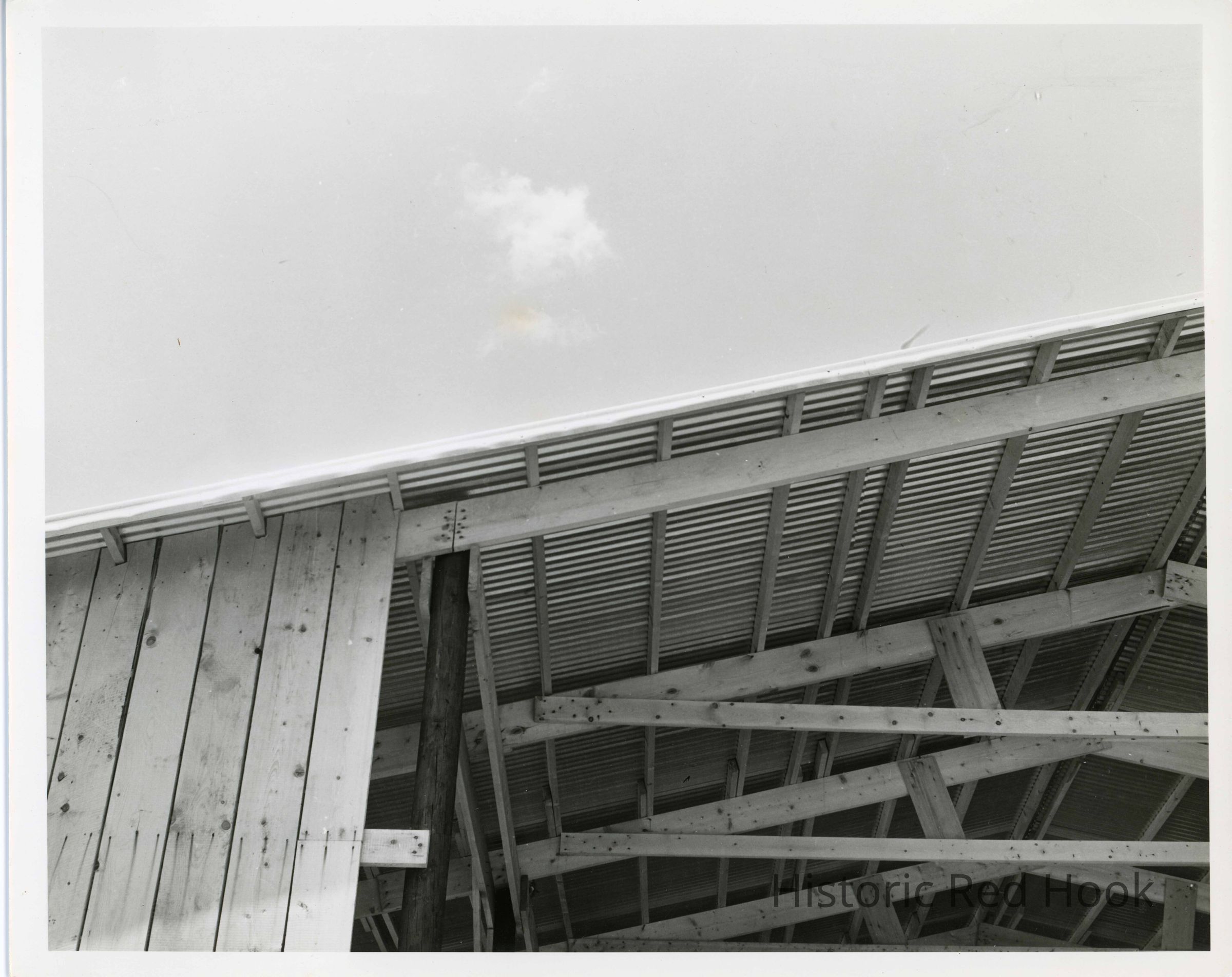 Barn-raising on Thomson property. Looking up at one end of unfinished barn.Collection