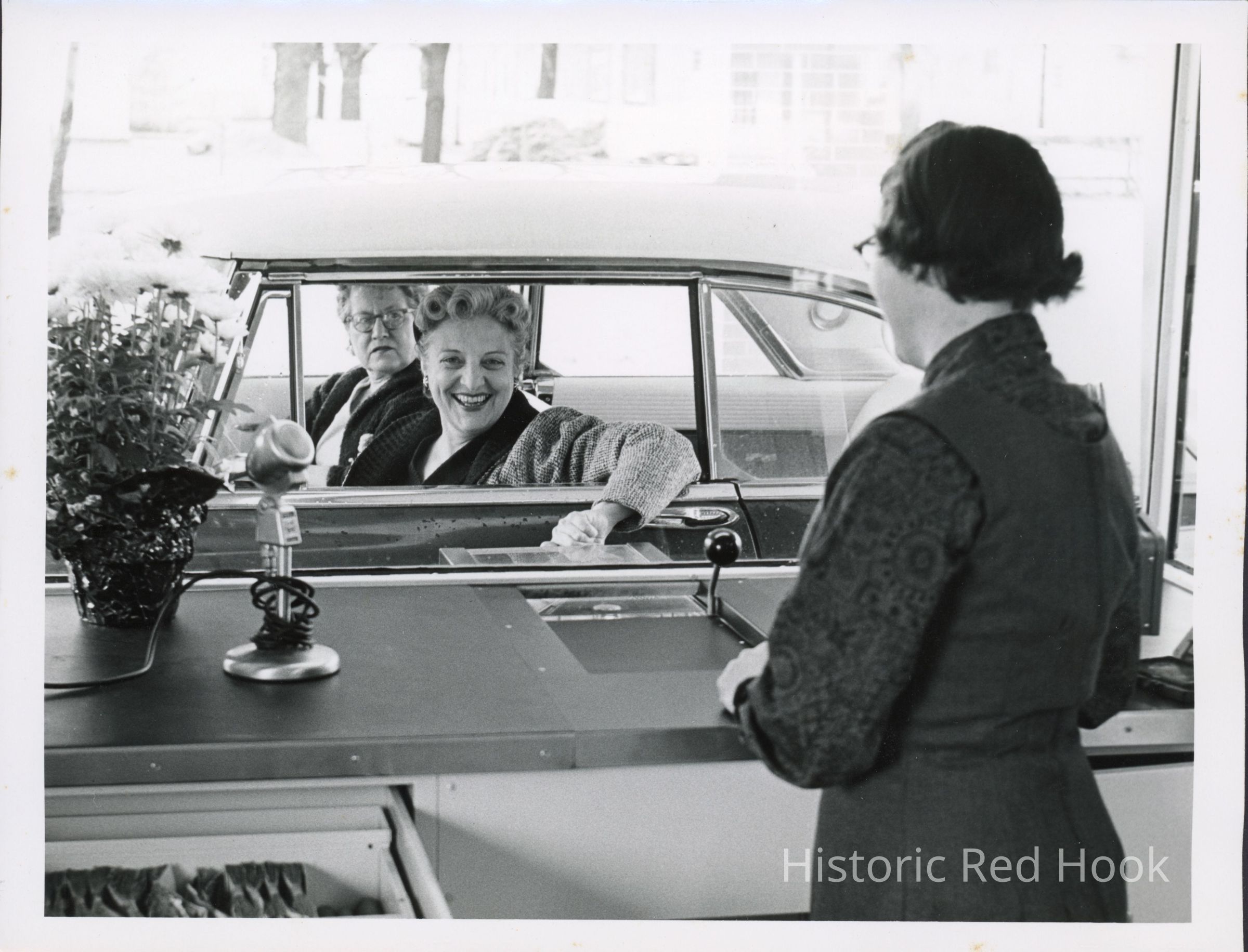 Olive Laib making first deposit at the drive-in window of the First National Bank (now Key Bank), c. 1960. Patricia Sass accompanies her.Photograph Details