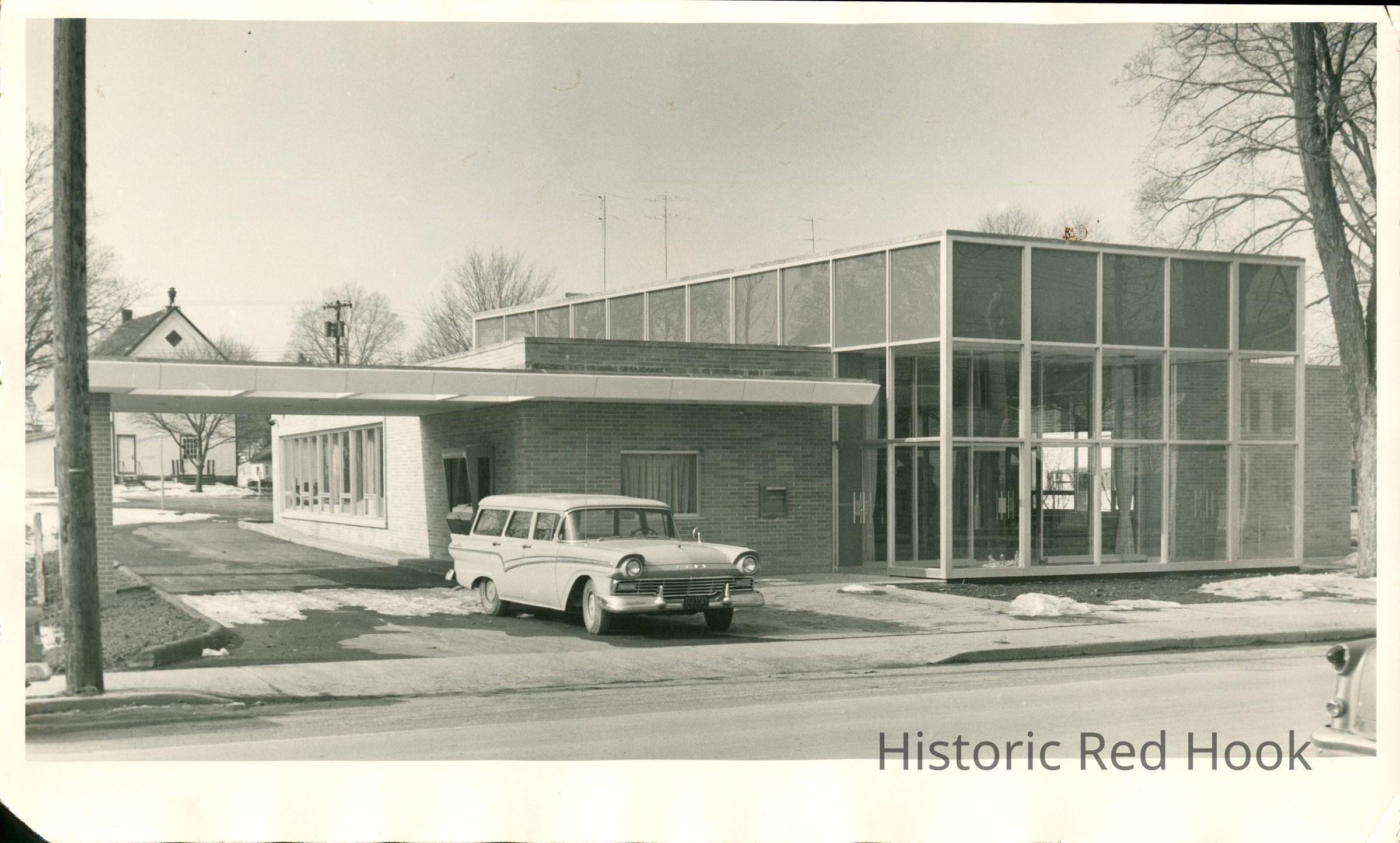 Photo of the new First National Bank bank (now Key Bank) on West Market St. Station wagon pulling away from drive-in window. c.1960Photograph Details
