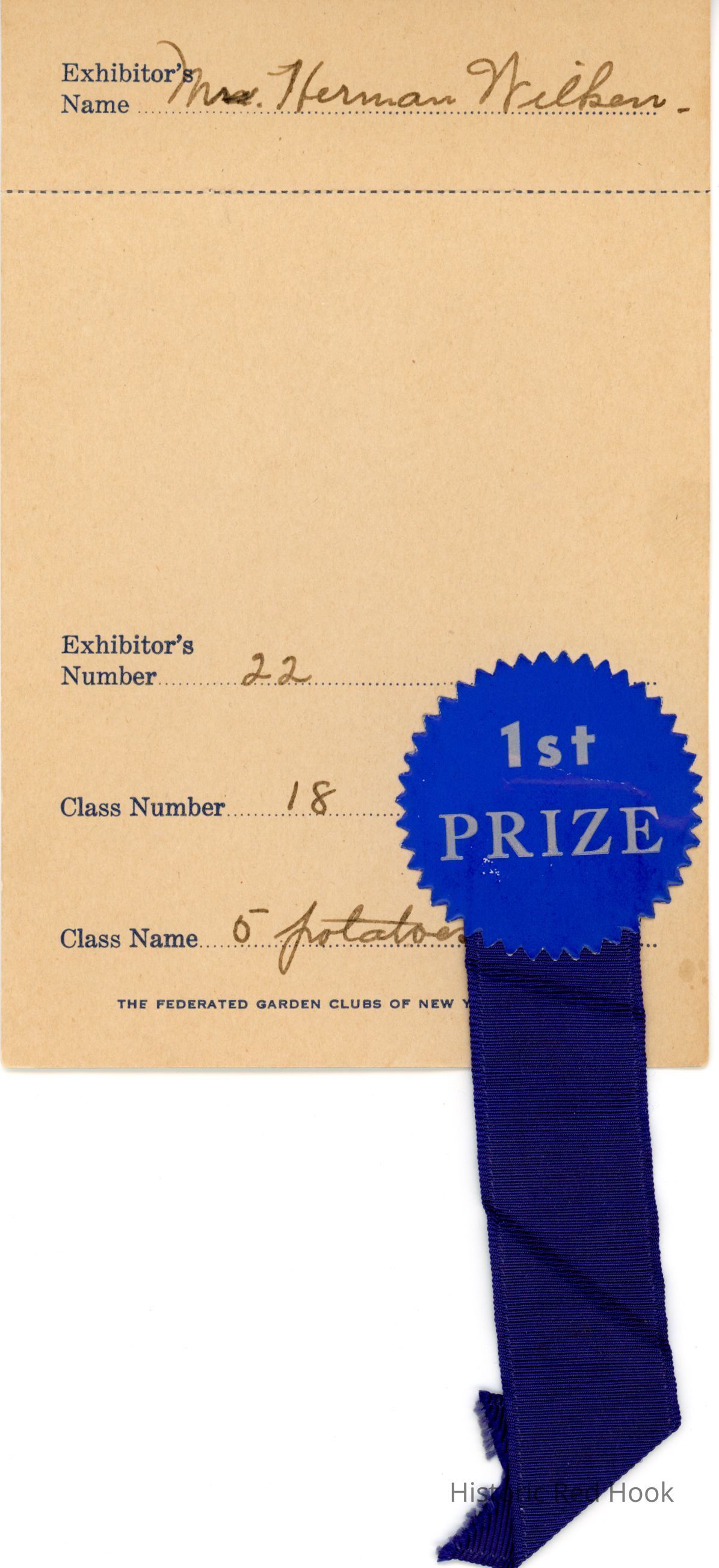 First place certificate from the Federated Garden Club of New York for Mrs. Herman Wilken's exhibit.Collection