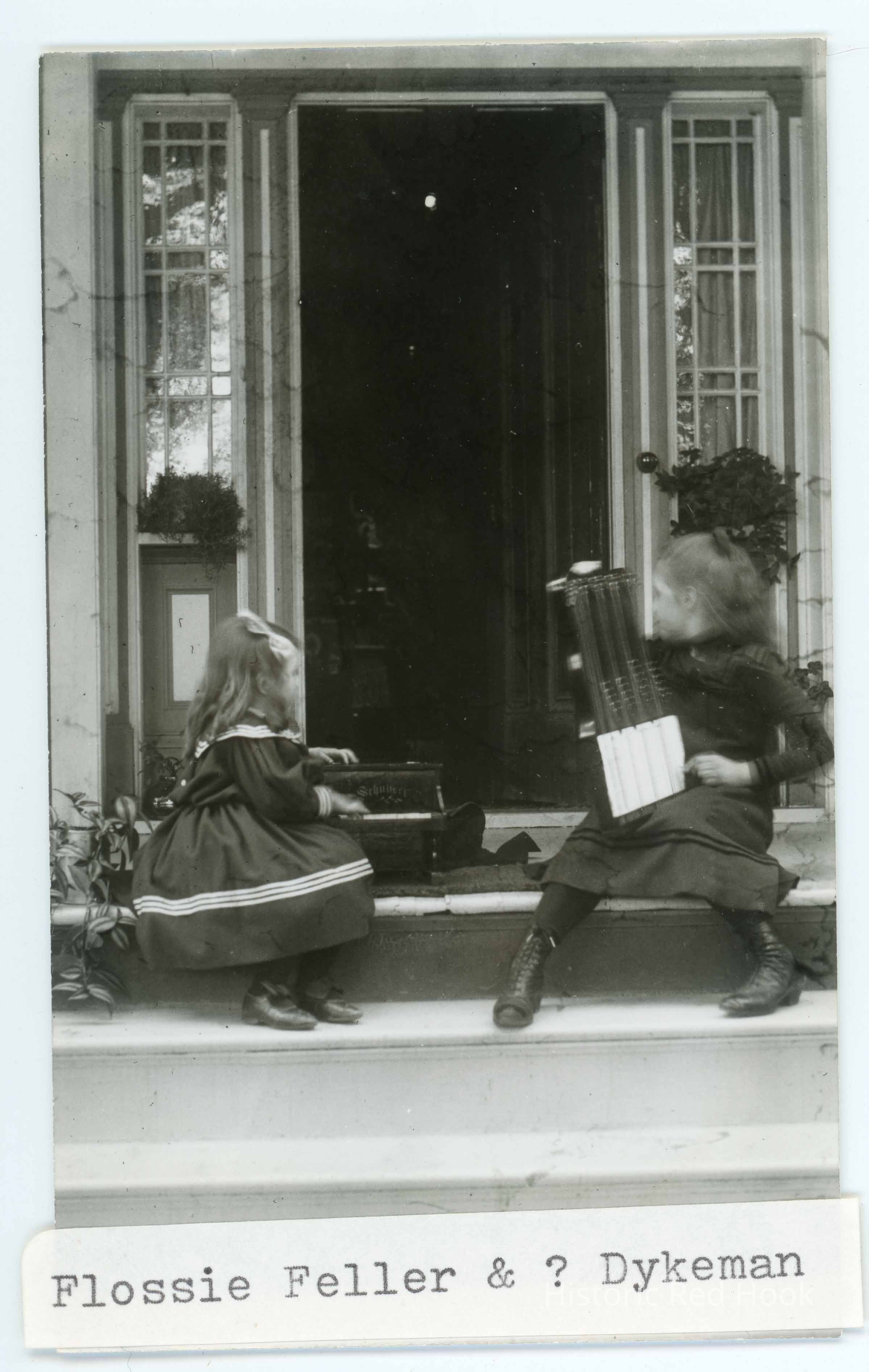 Two young girls seated on front steps of a home identified as Flossie Feller & Dykeman girl.