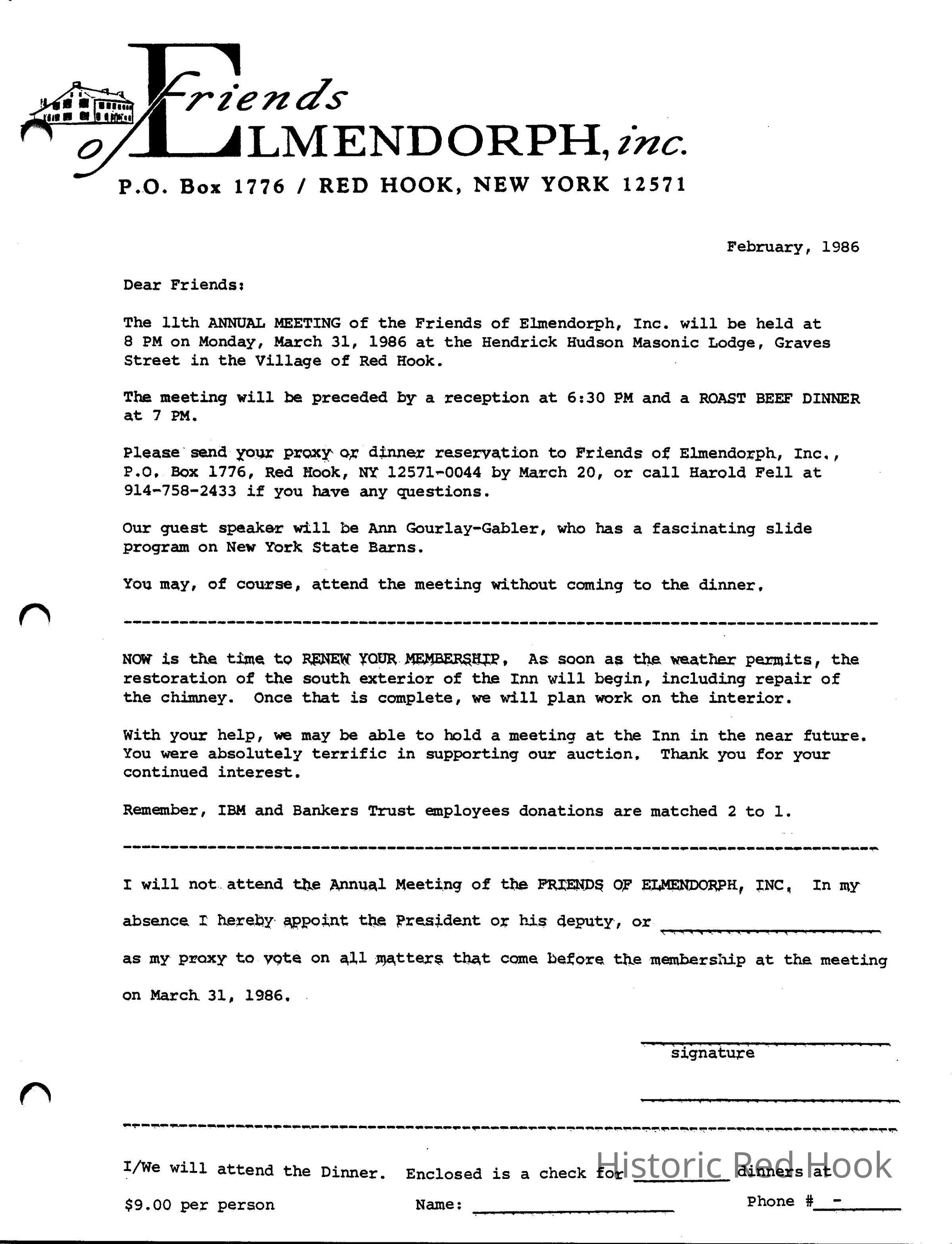 Friends of Elmendorph letter about the annual meeting to be held on March 31, 1986Relationships