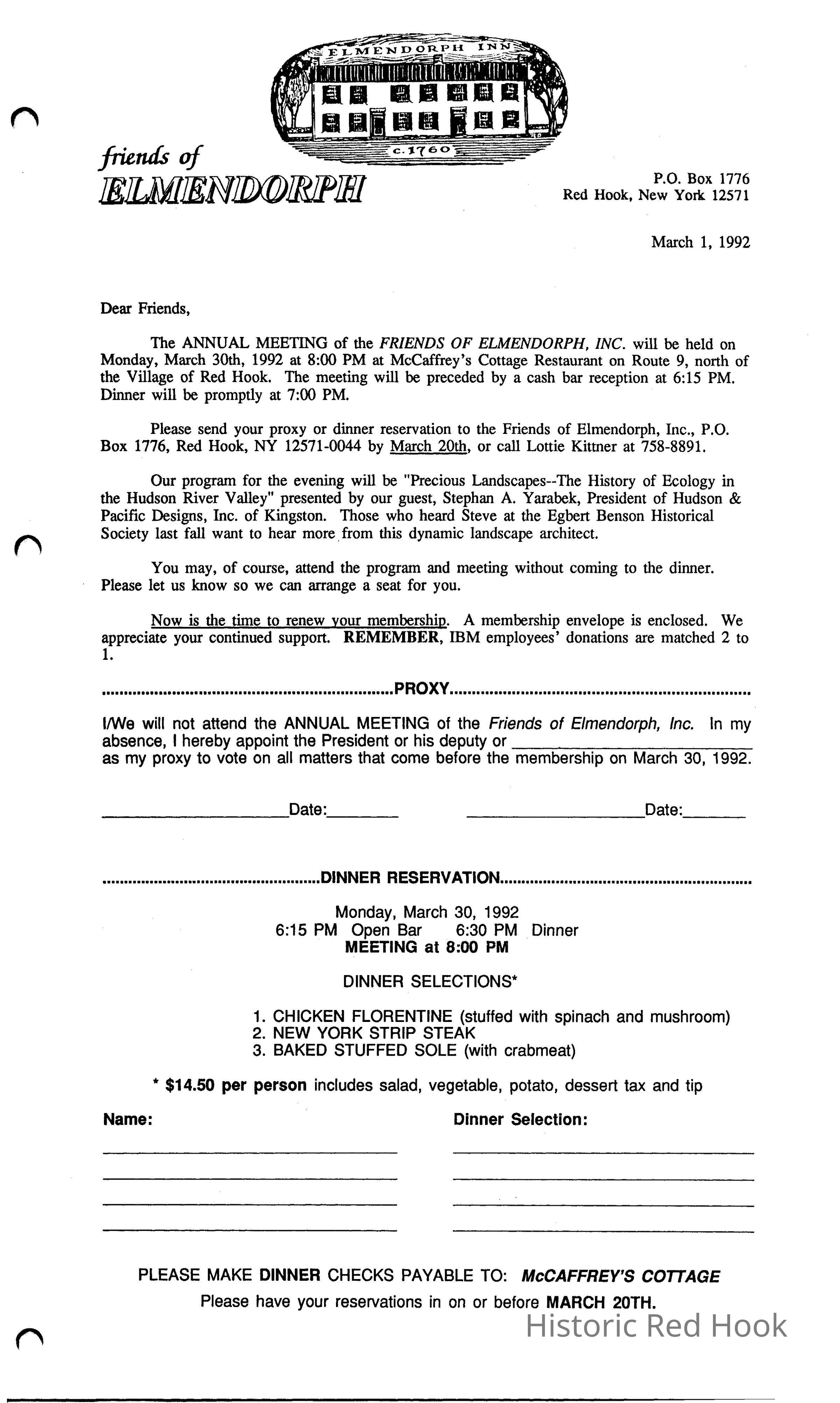 Friends of Elmendorph annual meeting letter, March 1992. Speaker was Stephen Yarabek, landscape architect.Relationships
